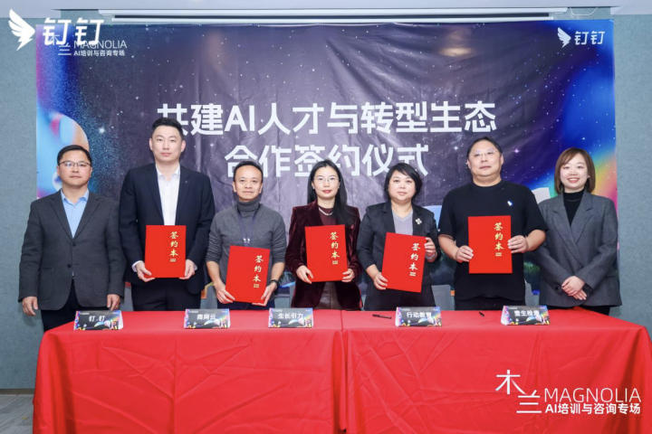 (图:钉钉与商网云、生长引力、行动教育、壹生健康签署共建AI人才与转型生态合作协议。)