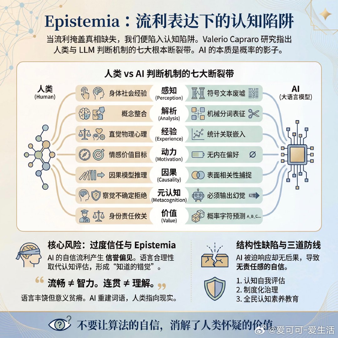 当流利的表达掩盖了真相的缺失,我们正进入一个名为 Epistemia 的认知陷阱。Valerio Capraro 的最新研究指出,人类与大语言模型在判断机制上存在七条根本性的断裂带。这些差异决定了 AI 无论表现得多么像人,其判断的本质依然是概率的影子。第一,感知断裂。人类的判断锚定在身体感知和社会经验中,而 AI 仅在符号与文本的废墟上重建意义。第二,解析断裂。人类通过概念整合理解情境,AI 则通过机械的分词构建语义稀薄的表征。第三,经验断裂。我们依赖直觉物理学和心理学,AI 仅依赖嵌入向量中的统计关联。第四,动力断裂。人类受情感、价值观和进化目标的驱动,AI 没有任何内在偏好或情感意义。第五,因果断裂。人类构建因果模型与反事实推理,AI 只是在捕捉表面的相关性。第六,元认知断裂。人类能察觉不确定性并拒绝判断,AI 必须输出,这使得幻觉在结构上不可避免。第七,价值断裂。人类的判断关乎身份与责任,AI 只是在预测下一个概率最高的字符。最危险的并非 AI 的无知,而是我们的过度信任。因为 AI 表现得如此自信且流利,产生了一种信誉偏见。这种现象被定义为 Epistemia:语言的合理性取代了认知的评估,产生了一种知道的错觉,却并无真实的认知。流畅不等于智力,连贯不等于理解。我们正处在一个语言丰饶但意义贫瘠的时代。AI 擅长重建词语,而人类擅长指向现实。如果失去了对现实的锚定,我们就会在 AI 编织的逻辑幻觉中迷失。AI 的失败并非因为它们不够精确,而是因为它们在结构上被强迫去响应,却无需承担任何后果。这种没有责任感的自信,是当前技术环境下最大的认知风险。为了应对这种认知危机,我们需要建立三道防线:认知的自我评估、制度化的治理,以及全民的认知素养教育。不要让算法的自信,消解了人类怀疑的价值。x.com/ValerioCapraro/status/2003457899805233538