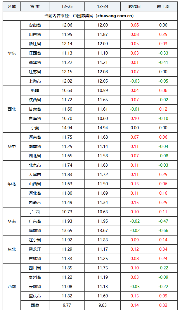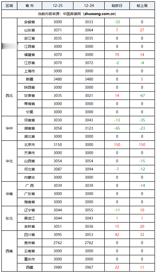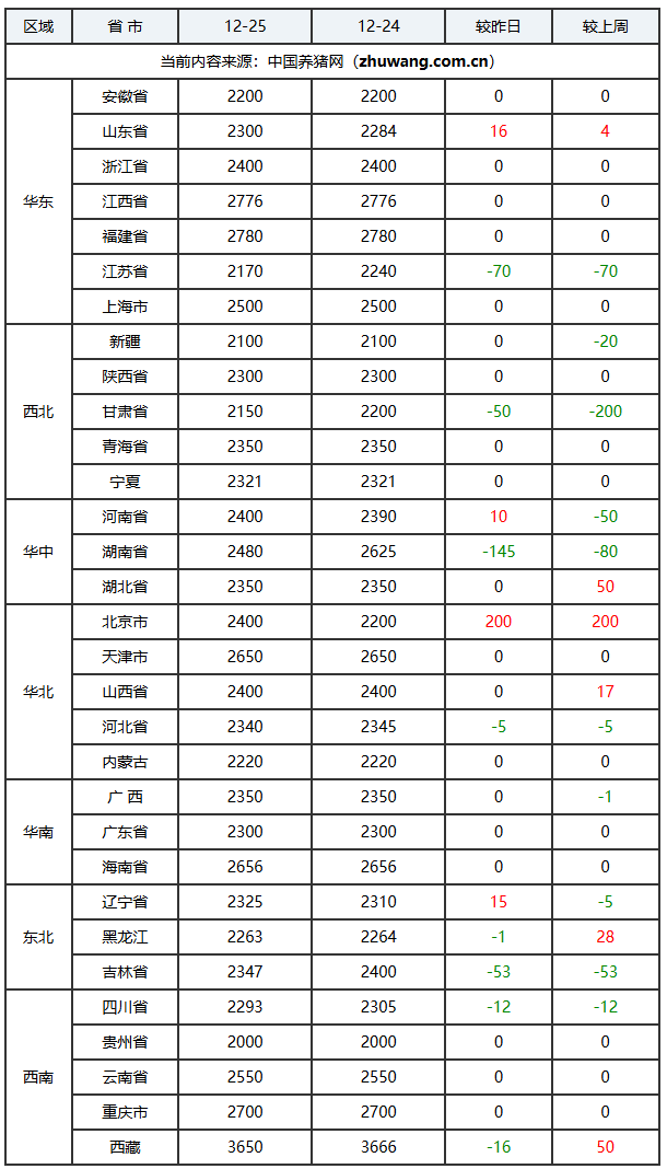 猪价上涨地区(24个):山东省、吉林省、陕西省、西藏自治区、安徽省、内蒙古自治区、辽宁省、黑龙江省、江苏省、河南省、湖北省、青海省、浙江省、新疆维吾尔自治区、湖南省、广西壮族自治区、江西省、北京市、天津市、河北省、山西省、四川省、贵州省、重庆市;上涨区间:0.01-0.15元/公斤;
