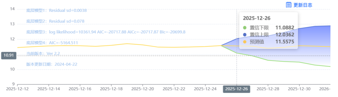 玄田算法是由项目课题组团队原创的非经典逻辑数值聚合理论和不确定性预测方法,构建了基于一致模算子的生猪价格预测模型。该模型采用的聚合函数及一致模相关理论与方法已获得多项国家自然科学基金和省级自然科学资金资助,并获得多项省级自然科学奖奖项。12月26日预测猪价为11.5575,置信区间在11.0882--12.0362之间。12月27日预测猪价为11.5411;12月28日预测猪价为11.4010。