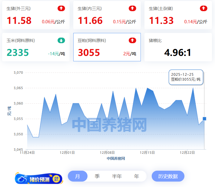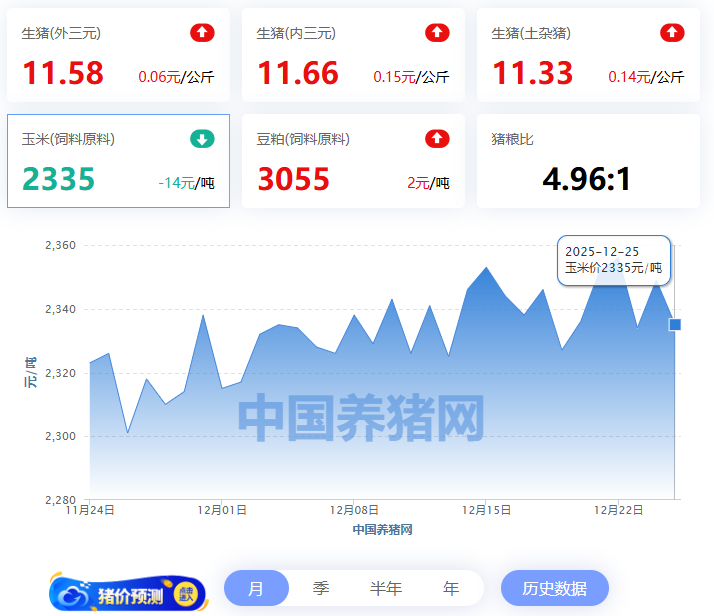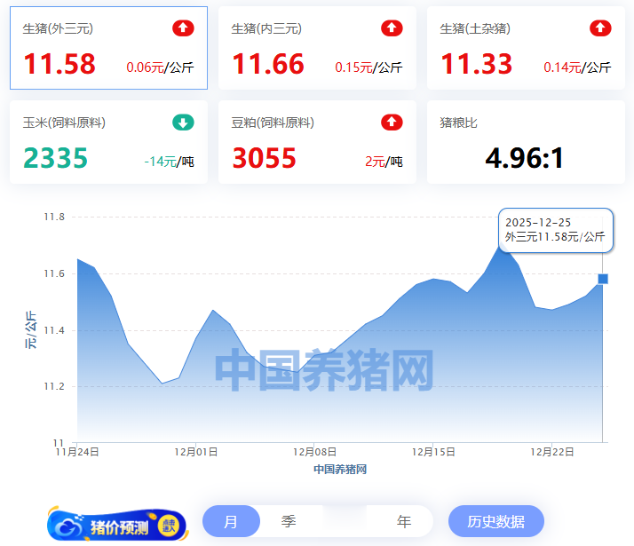 全国(生猪品种:外三元)均价为11.58元/公斤,猪价较昨日上涨0.06元/公斤,环比下跌0.34%,同比下跌25.53%;