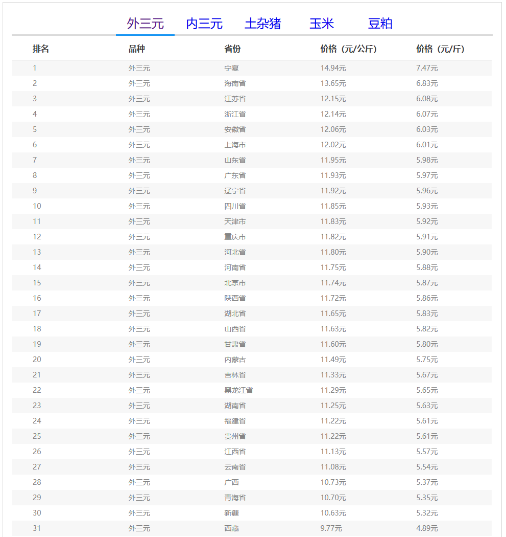 外三元排行前三:宁夏回族自治区14.94元/公斤、海南省13.65元/公斤、江苏省12.15元/公斤;