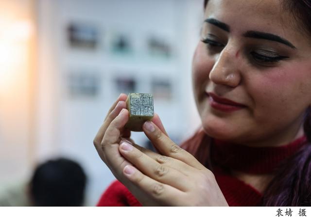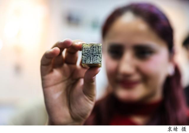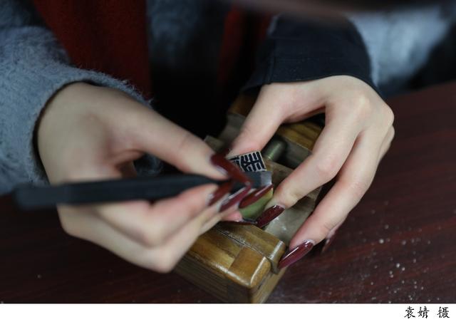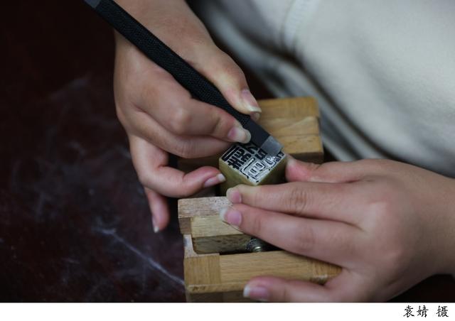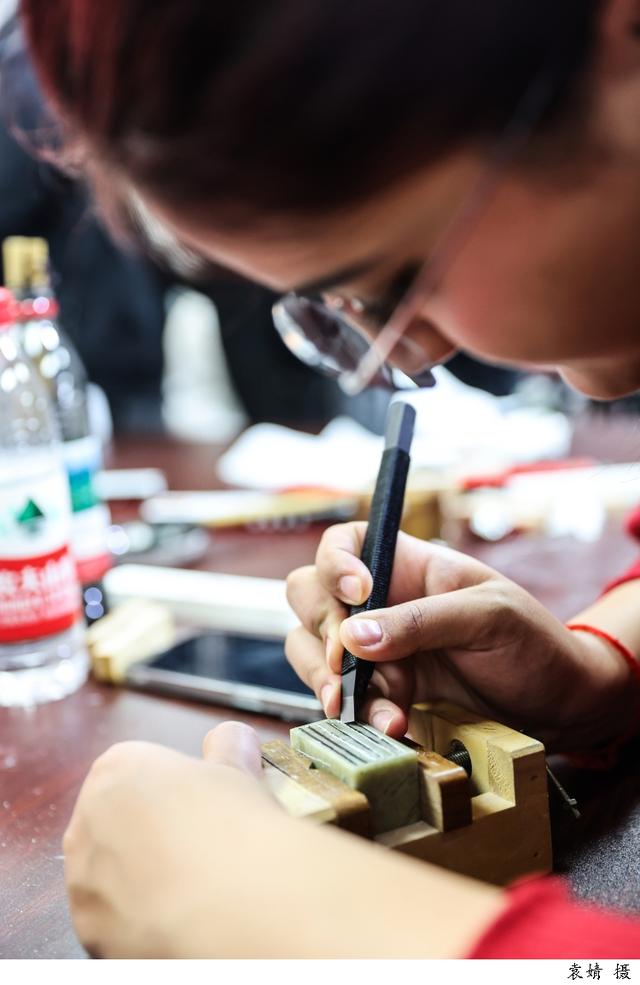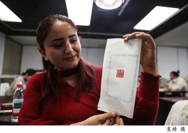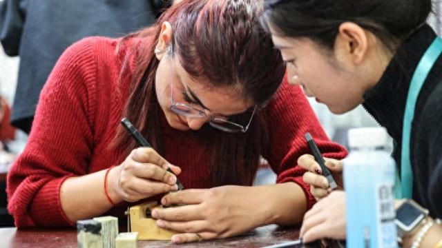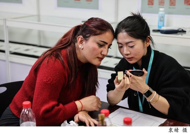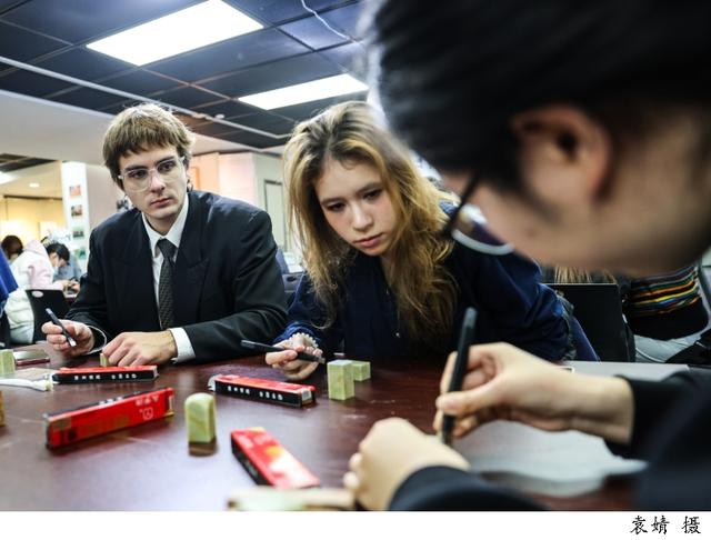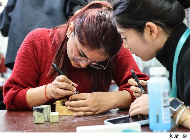 图为来自塔吉克斯坦的留学生李欣冉(中文名)在华东师大书法篆刻研究生同学的指导下体验篆刻艺术,亲手用刻刀将自己的中文名字刻成印章。