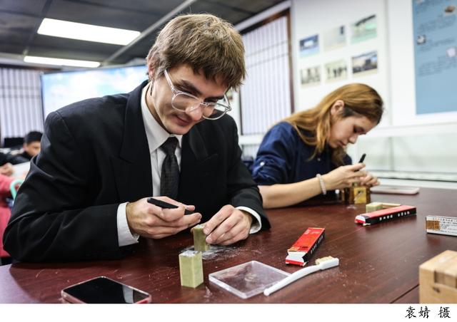 图为来自俄罗斯的留学生赵吉(中文名)正在现场体验篆刻。