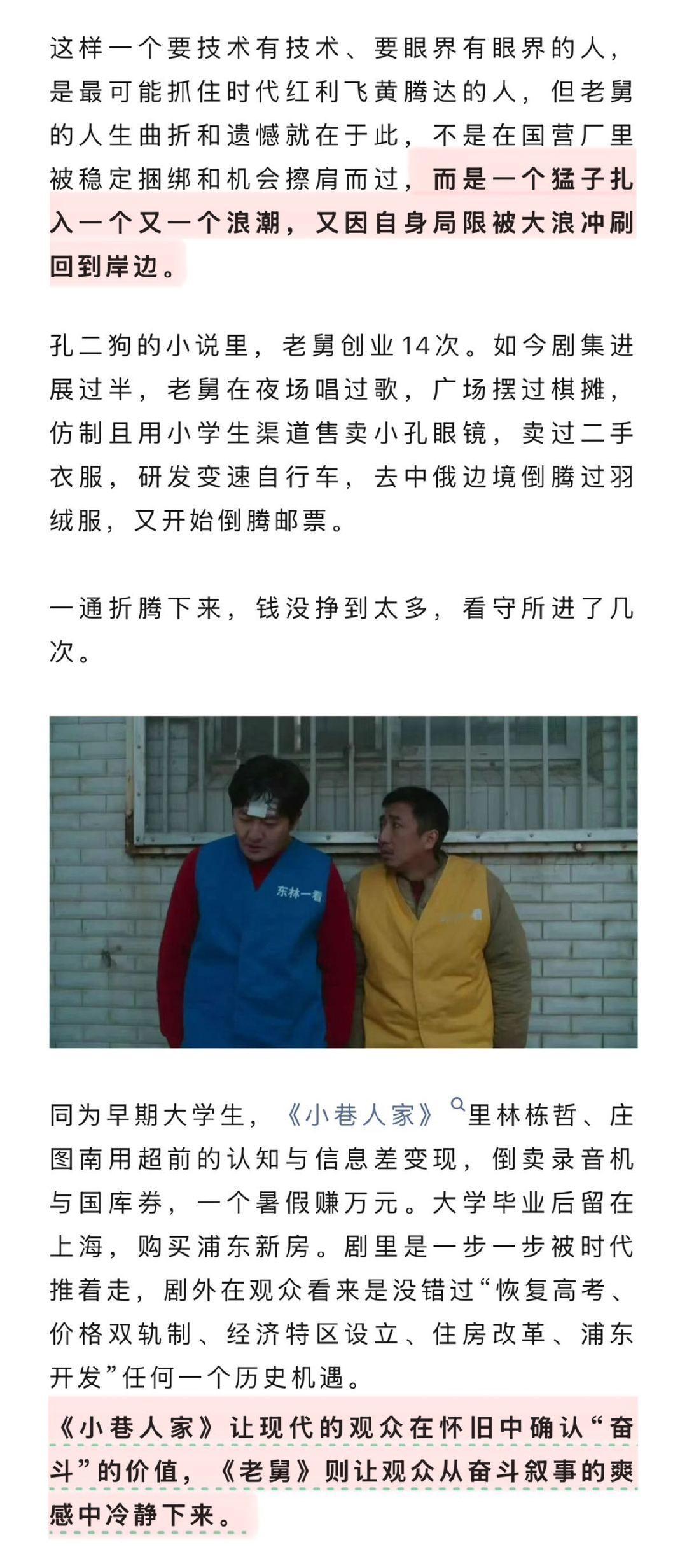 年代剧里的失败者还能让人共情吗 年代剧为什么钟爱东北叙事 《小巷人家》里林栋哲、庄图南没错过“恢复高考、价格双轨制、经济特区设立、住房改革、浦东开发”任何一个历史机遇。《老舅》凭借天份无限靠近成功,却无法守住财富。知道正确的解法,却无法狠下心来抛弃“累赘”,于是只能在时代浪潮中“晕头转向”。↓