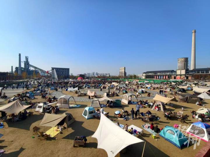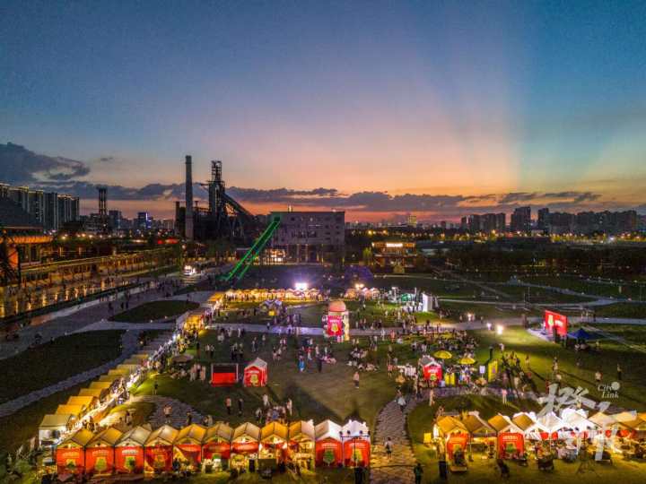顺着游乐园旁的火车轨道往里走,沿路的机械仪表、钢铁管道、老厂房从身旁一一掠过,几个高大的烟囱高炉出现在眼前,厚重的工业感扑面而来,中间的大草坪上扎着一顶顶样式各异的帐篷。