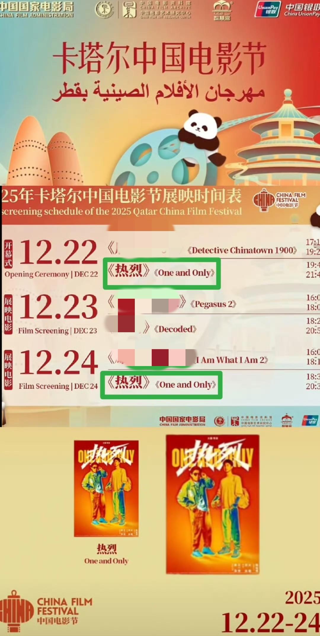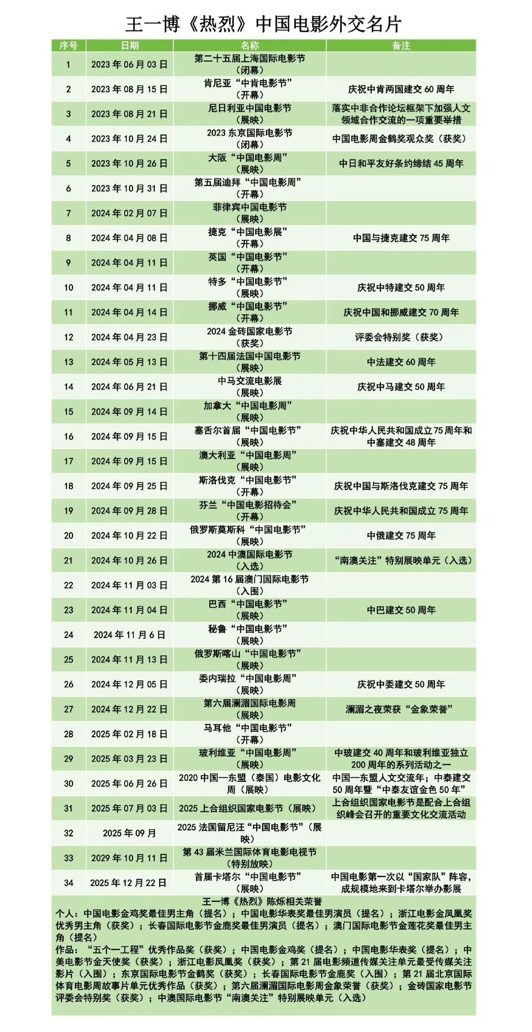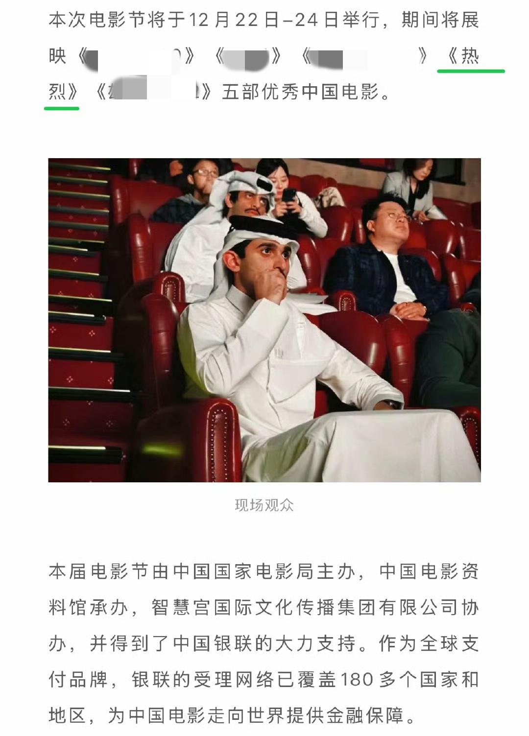 王一博主演的电影《热烈》又双叒叕出海了!首届卡塔尔“中国电影节”将展映电影《热烈》 [赞]。 《热烈》还是此次唯一一部展映两天两次的影片,中国电影外交名片名副其实。 “这是中国电影第一次以“国家队”阵容,成规模地来到卡塔尔举办影展”,而在五部展映影片中就有王一博主演的《热烈》[赞]。 是的,就是王一博凭借陈烁一角获得金鸡华表影帝双提的《热烈》! 王一博
