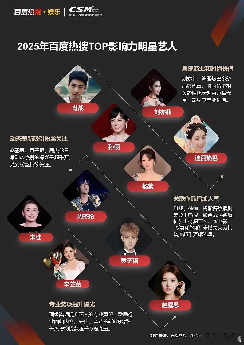 2025百度热度影响力报告 2025百度热度影响力品质剧集:肖战《藏海传》91.8于和伟《沉默的荣耀》86.5杨紫、李现《国色芳华》86.2白鹿、欧豪《北上》83.6王宝强《棋士》83.6杨幂、欧豪《生万物》83.42025百度热度TOP影响力艺人:肖战、孙俪、杨紫、刘亦菲、迪丽热巴、黄子韬、赵露思、宋佳、辛芷蕾