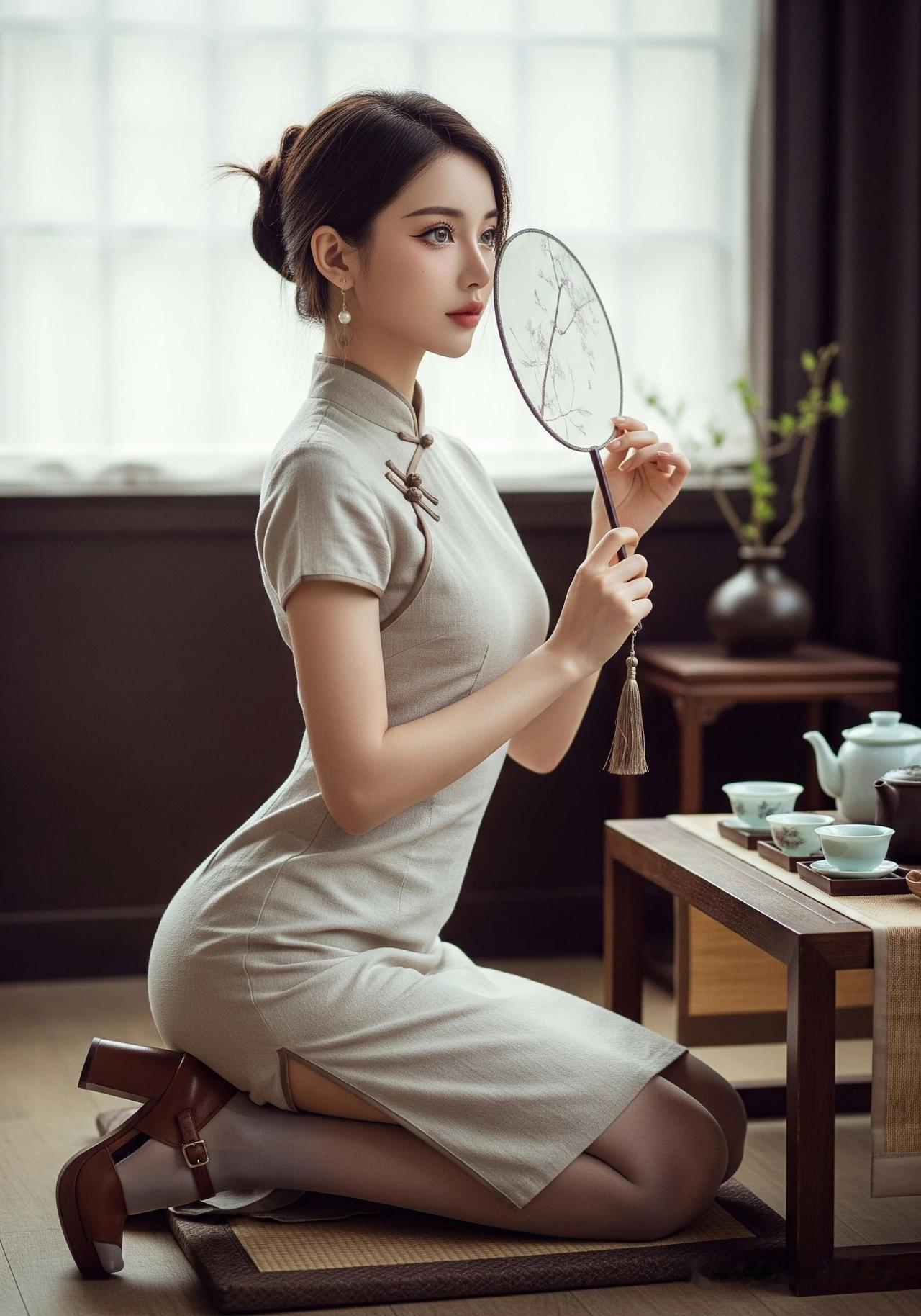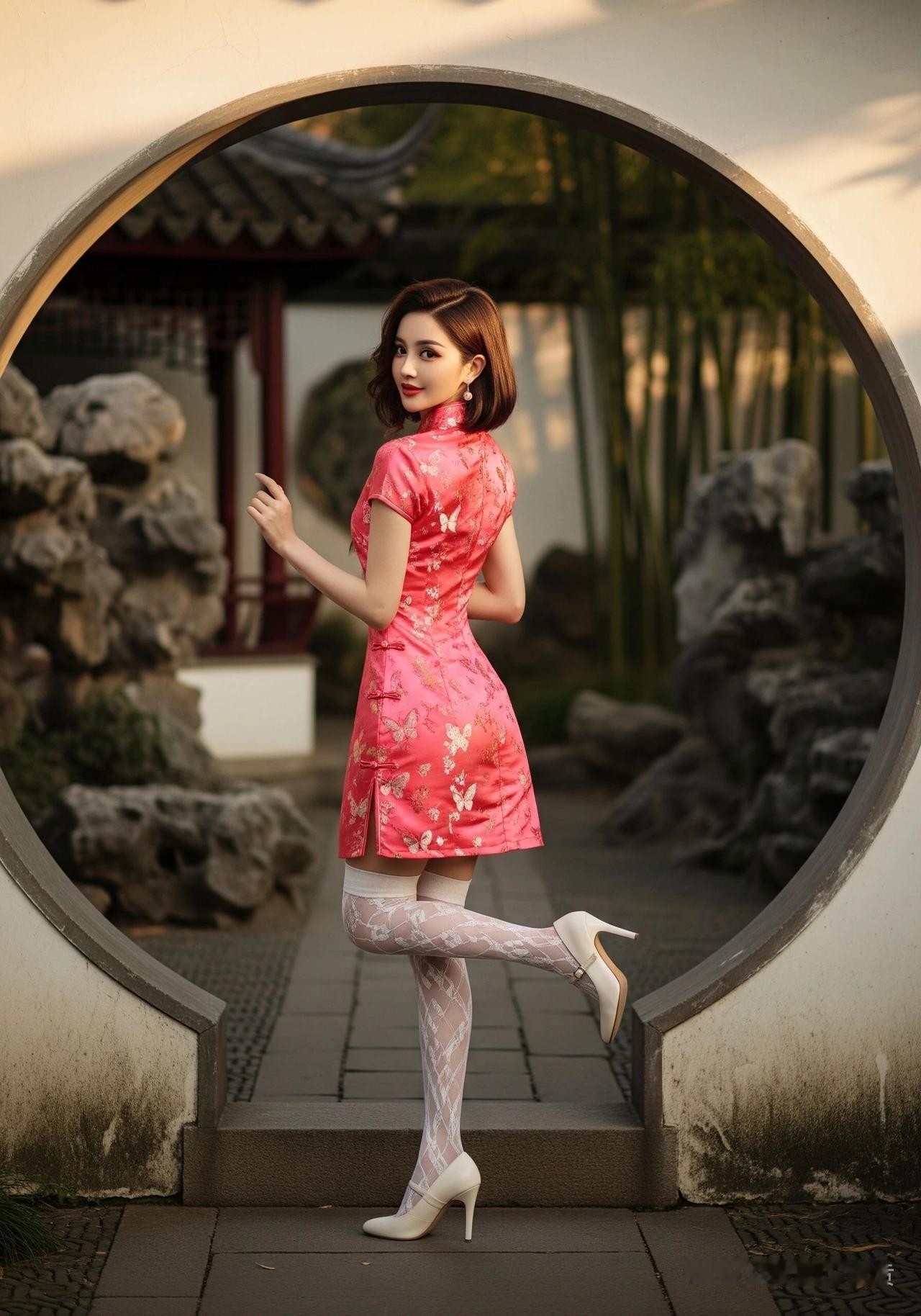 美女 旗袍山水 旗袍园林 旗袍风景 锦绣玲珑步若仙, 暗香浮动月门前。 回眸一