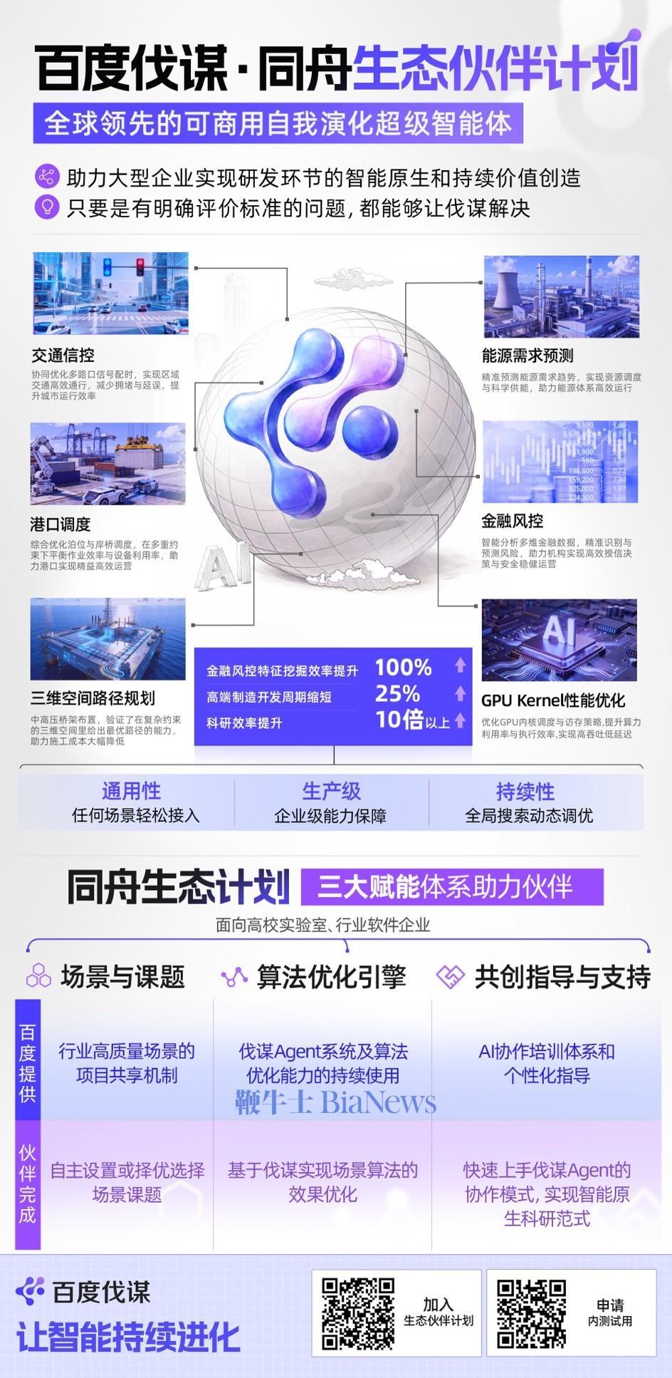 12月25日,在百度AIDay活动上,百度公布超级智能体百度伐谋的最新进展:发布一个月以来,已有超2000家企业申请试用,覆盖物流、制造、AI4S等领域,帮助上述行业客户高效探寻全局最优解。会上,百度伐谋还宣布围绕通用性、生产级、持续性等方向进行产品能力升级,并正式发布“同舟生态伙伴计划”,面向高校实验室及行业软件企业开放核心能力,以生态共创的方式加速推进AI进产业。