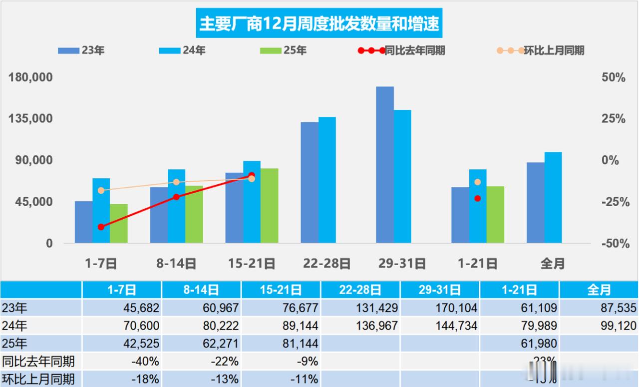 12月第一周全国乘用车市场日均零售4.2万辆,同比去年12月同期下降32%,较上月同期下降8%。12月第二周全国乘用车市场日均零售6.7万辆,同比去年12月同期下降17%,较上月同期增长9%。12月第三周全国乘用车市场日均零售7.7万辆,同比去年12月同期下降11%,较上月同期增长9%。12月1-21日,全国乘用车市场零售130.0万辆,同比去年12月同期下降19%,较上月同期增长5%;今年以来累计零售2,278.3万辆,同比增长4%。全国乘用车新能源市场零售78.8万辆,同比去年12月同期增长1%,较上月同期增长3%,全国乘用车市场新能源零售渗透率60.6%就看12月能不能月度破60%的大关了新能源汽车