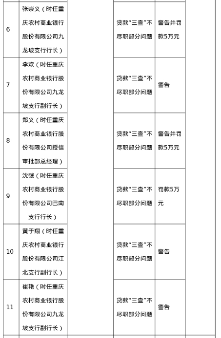 罚单显示,重庆农村商业银行股份有限公司的主要违法违规事实(案由)为:贷款“三查”不尽职;对大额风险损失的调查和问责不到位;非现场统计数据差错;未核实保证金来源;滚动开票。