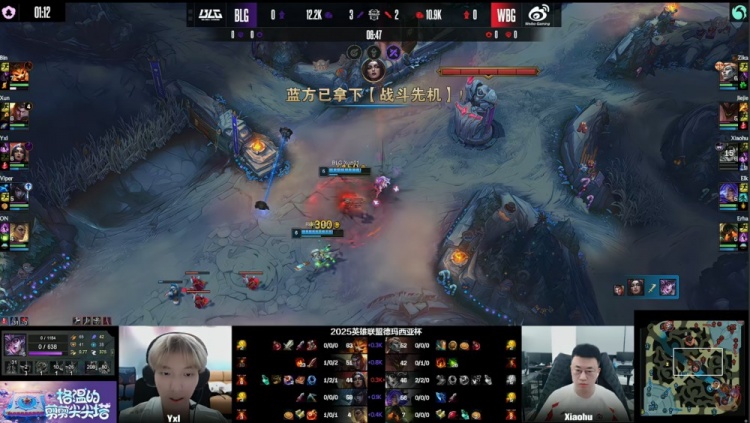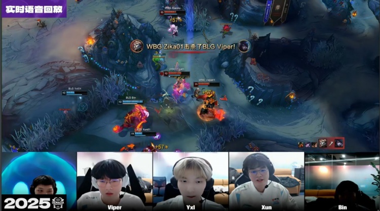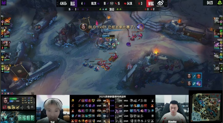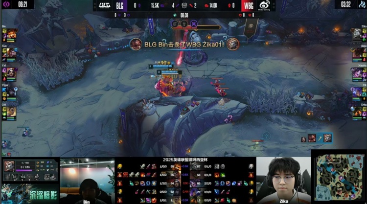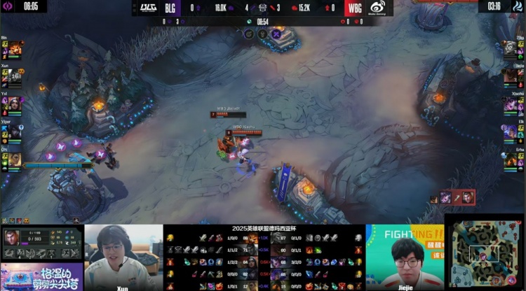 [18:09]小龙团,Viper红白刀向前击杀Erha后被Zika亚恒砍掉,双方打出2换2。河道继续开战,阿Bin配合队友击杀WBG上野,BLG回头开小龙,WBG三人看小龙被Xun杰斯一炮劝退。BLG听牌炼金龙魂。