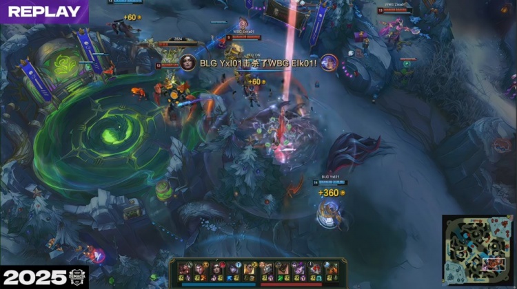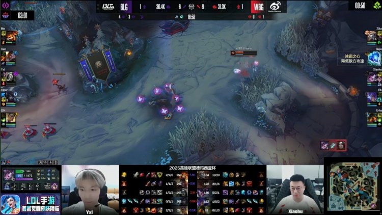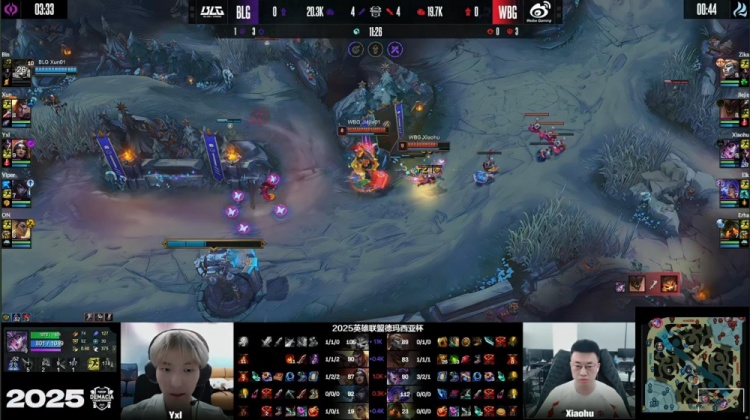 [16:08]中路团战,Erha泰坦钩Viper厄斐琉斯,Jiejie石头人顺势开大,双方辅助互换,WBG打出1换2,Yxl残血妖姬下路想找xiaohu被后者辛德拉大招直接融化单杀。