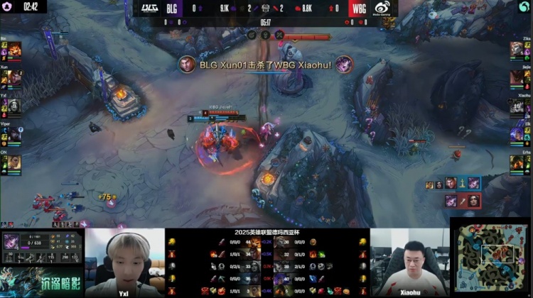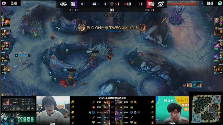 [21:03]厄塔汗团战,ON芮尔先被WBG集火秒杀,Yxl妖姬单杀Zika亚恒,三角草Jiejie被逮捕直接大招逃生,BLG回头拿到厄塔汗,双方经济持平。