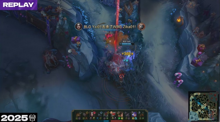 [8:46]Yxl妖姬去上gank配合阿Bin纳尔变大拍Zika亚恒上墙将其击杀,同时中路Jiejie石头人撞飞Xun杰斯帮助Xiaohu辛德拉再拿一个人头。