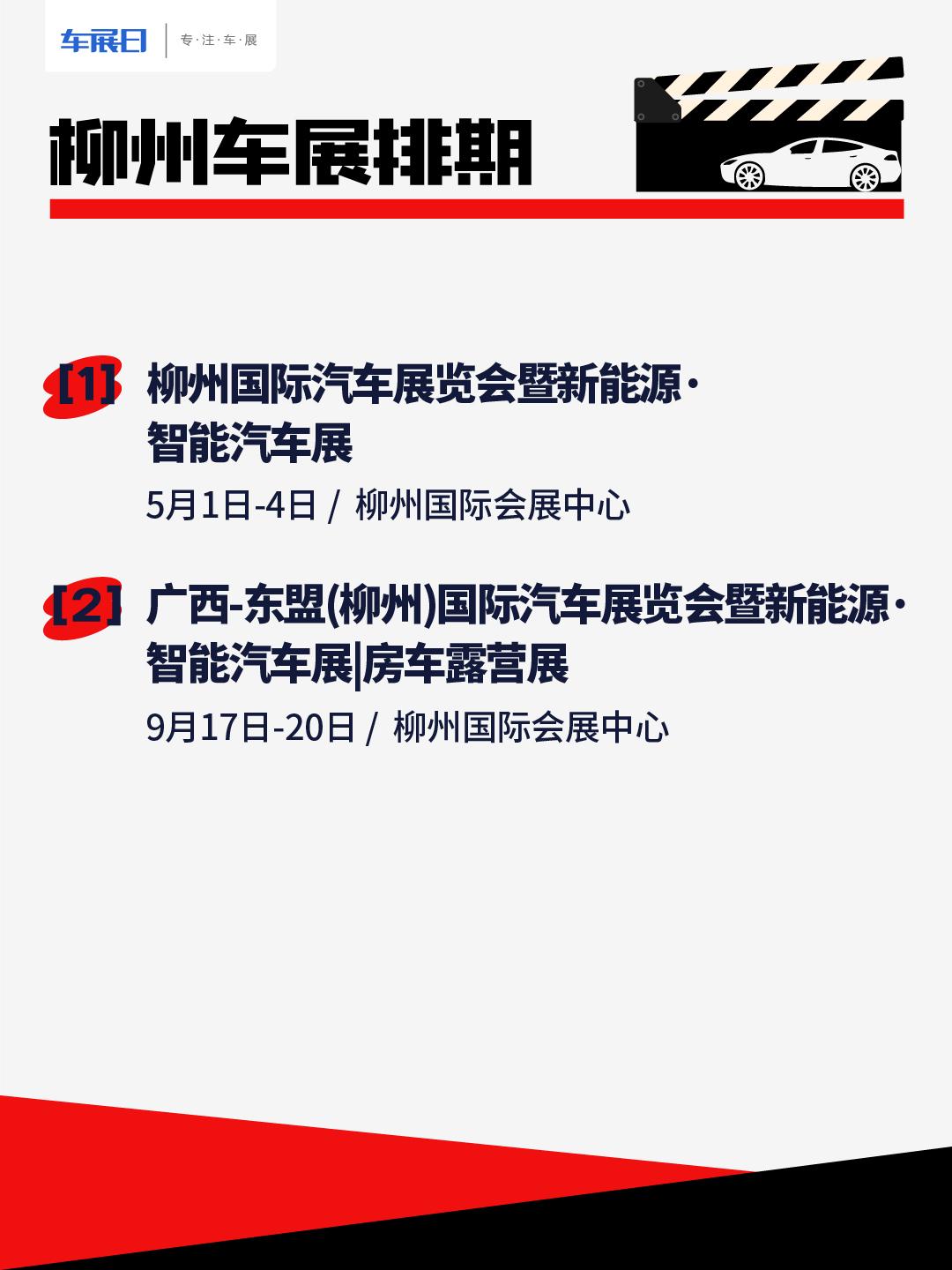 2026柳州车展时间排期。2026年柳州将举办两场大型车展,举办地点都在柳州国际会展中心。其中柳州国际车展将在5月1日至4日举办,东盟柳州车展举办时间是9月17日至20日。这两场柳州车展都是我们车展日的合作车展,到时候会有免费的柳州车展门票送哟!【来自懂车帝车友圈】