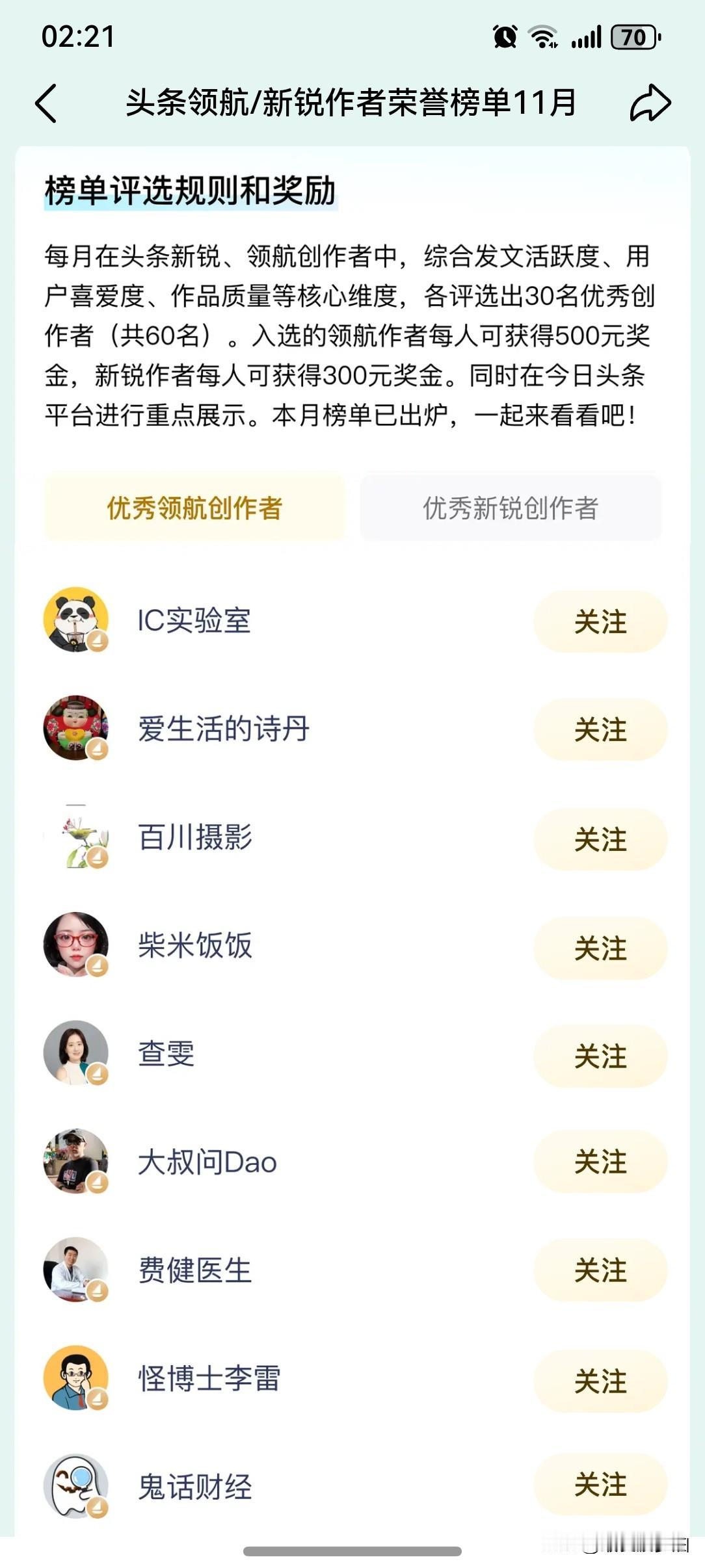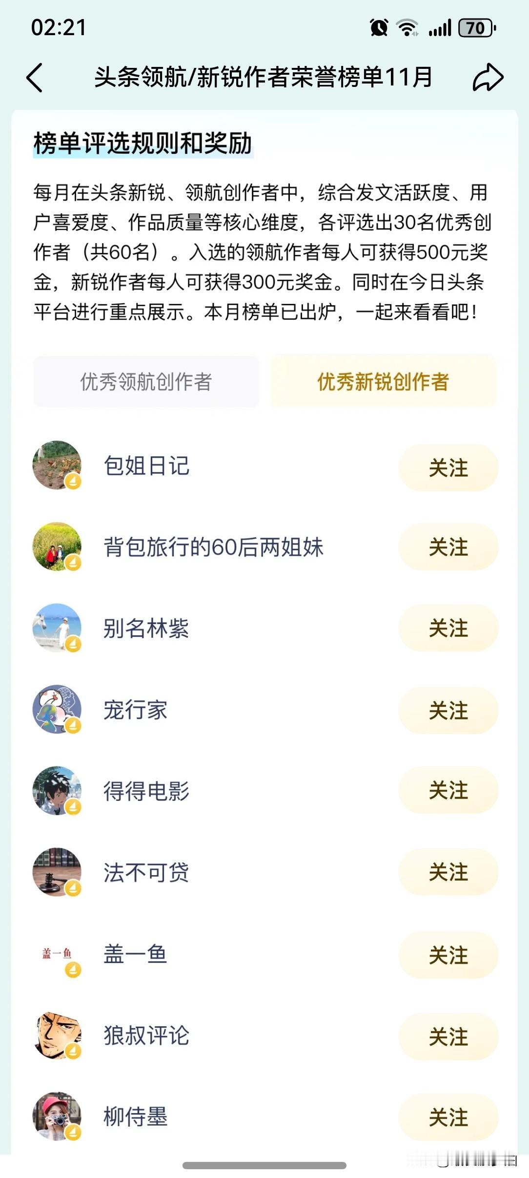 上午收到微头条小秘书发来的消息提示:“亲爱的最爱菠萝油,头条领航、新锐创作者11月荣誉榜单已出炉,快来看看本月有哪些作者上榜吧!” 于是赶紧打开“查看榜单”一探究竟!瞬间生出一丝查看考试成绩的紧张! 满怀希望地打开,黯然神伤地关闭! 好了!不在榜单里!悬着的心终于死了! 上榜可得300元~500元奖金!这么丰厚的奖金,可惜没有我的份啊!