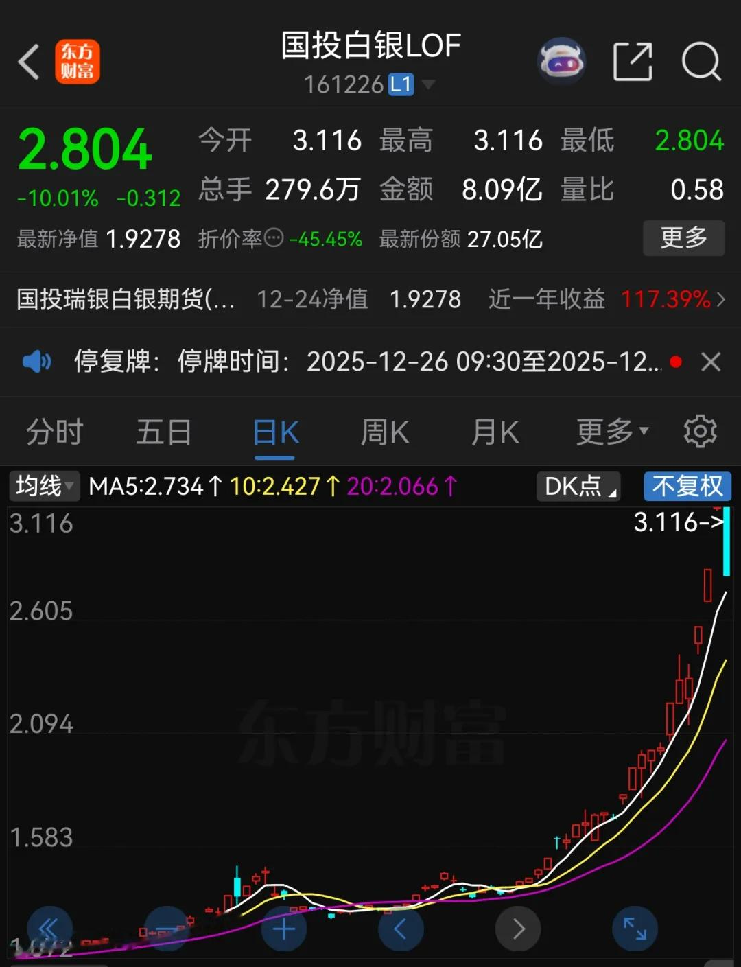 另外,其今日还公告称,截至2025年12月25日,本基金二级市场的收盘价为2.804元,明显高于基金份额净值,投资者如果盲目投资于高溢价率的基金份额,可能面临较大损失。为保护投资者利益,本基金将于2025年12月26日开市起至当日10:30停牌,自2025年12月26日10:30复牌。