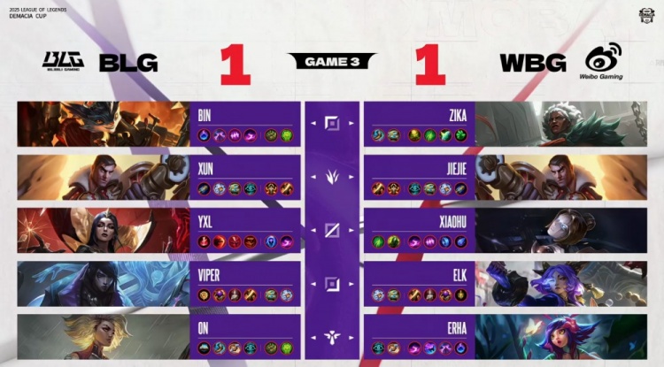 [15:40]中路AD对拼,Elk芸阿娜轰掉Viper厄斐琉斯,随后WBG三人上路逮捕彬大哥,但Zika被Yxl妖姬踩掉,双方上单互换,河道Yxl妖姬裁掉Erha妮蔻,侧面Elk到正面被ON逮捕死前换掉Yxl,Viper厄斐琉斯收割战场双杀,Zika复活TP上路被赶走,BLG打出3换4。