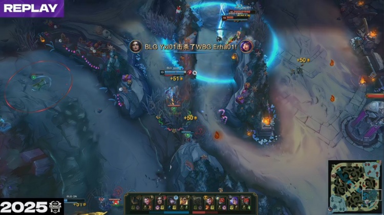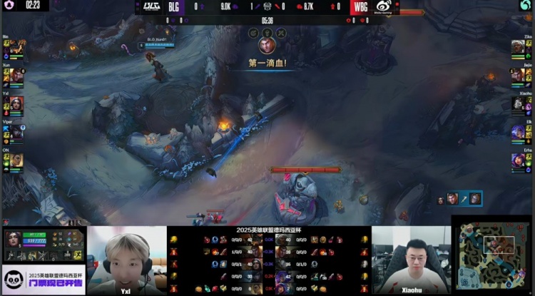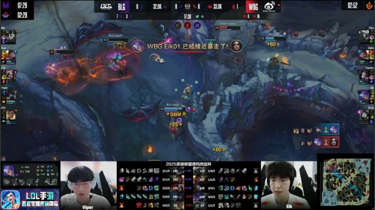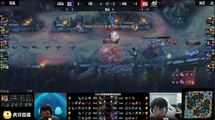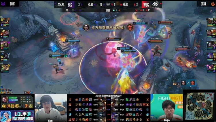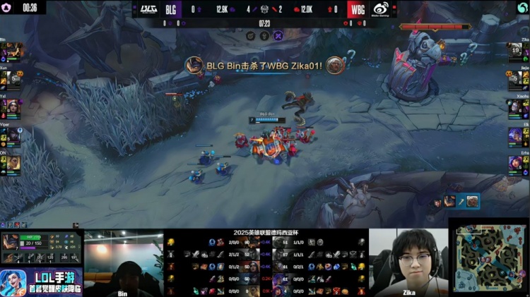 [23:59]BLG中路推进,Erha变小兵绕后开团,正面Viper厄斐琉斯双杀后被Elk芸阿娜反轰双杀,WBG打出1换4,推掉BLG中路二塔。