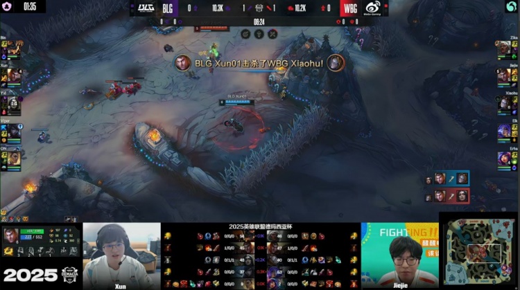 [25:48]Zika安蓓萨正面空大但依旧击杀Xun杰斯,Jiejie杰斯轰掉ON,WBG打出0换2回头拿到火龙魂,经济领先5k。