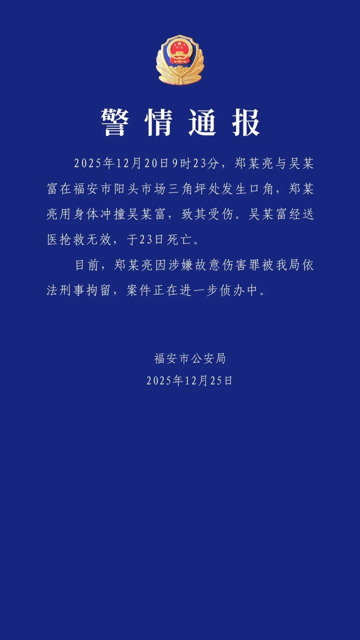 12月20日9时23分,郑某亮与吴某富在福安市阳头市场三角坪处发生口角,郑某亮用身体冲撞吴某富,致其受伤。吴某富经送医抢救无效,于23日死亡。目前,郑某亮因涉嫌故意伤害罪被依法刑事拘留,案件正在进一步侦办中。
