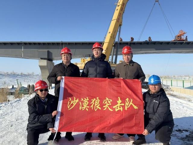 2号桥坐落于北沙窝沙漠腹地,冬季低温积雪的恶劣环境给现场施工带来诸多挑战。项目部主动攻坚,精准把控吊装、定位、焊接等关键工序,最终高效完成钢箱梁架设合龙任务。