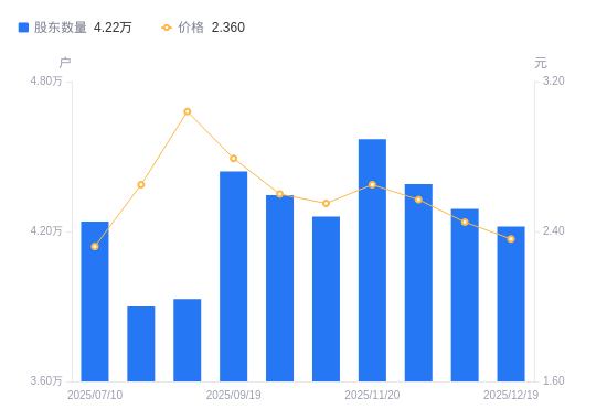 近一年(2024年12月20日至2025年12月19日),福星股份A股股东户数从4.56万户,减低至4.22万户,降幅7.46%,区间股价下跌16.01%。