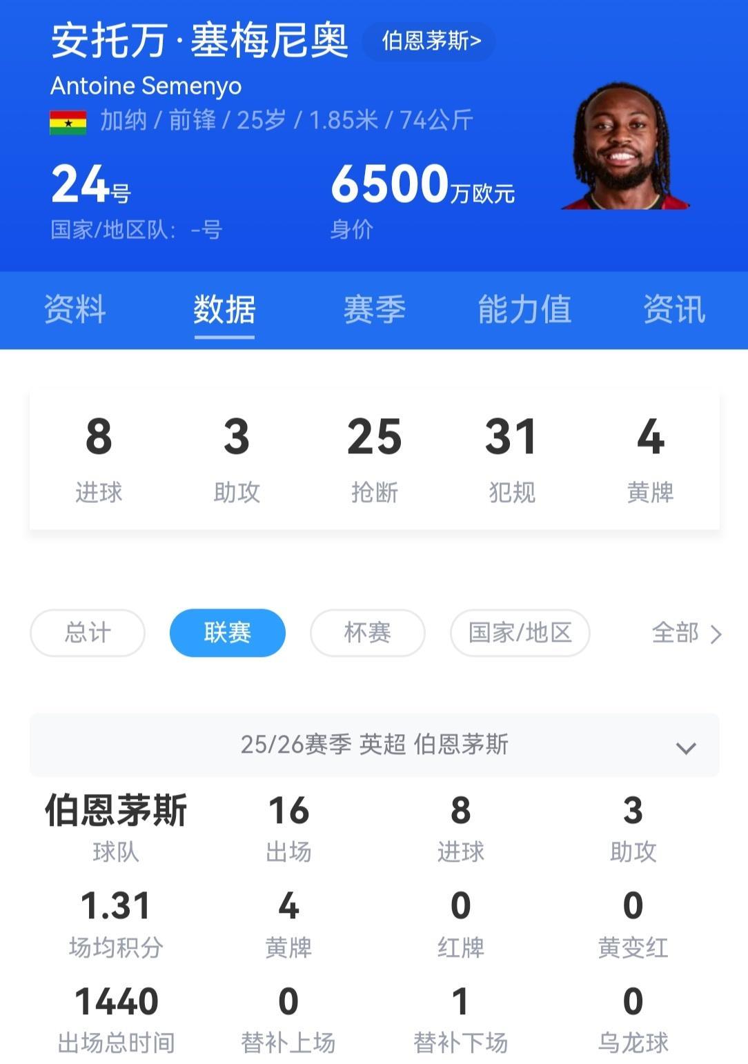 即将进城、再签强援 根据罗马诺的最新消息,曼城正在推进赛梅尼奥的转会,未来几日将完成这笔签约! 赛梅尼奥本赛季在伯恩茅斯堪称大腿级,今年25岁的他为小樱桃出战17场比赛,贡献8粒进球和3次助攻,目前德转身价在6500万欧元,赛梅尼奥的合同中包含6500万欧元的解约金条款,有效期至1月10号,蓝月亮会与伯恩茅斯商讨不同的交易结构和支付方式! 虽然曼联、切尔西、利物浦、热刺都对赛梅尼奥感兴趣,但球员本人的首选是曼城,蓝军和热刺已经退出争夺,红军、红魔还在积极询问,如果没有意外,赛梅尼奥将会披上蓝月亮的战袍!