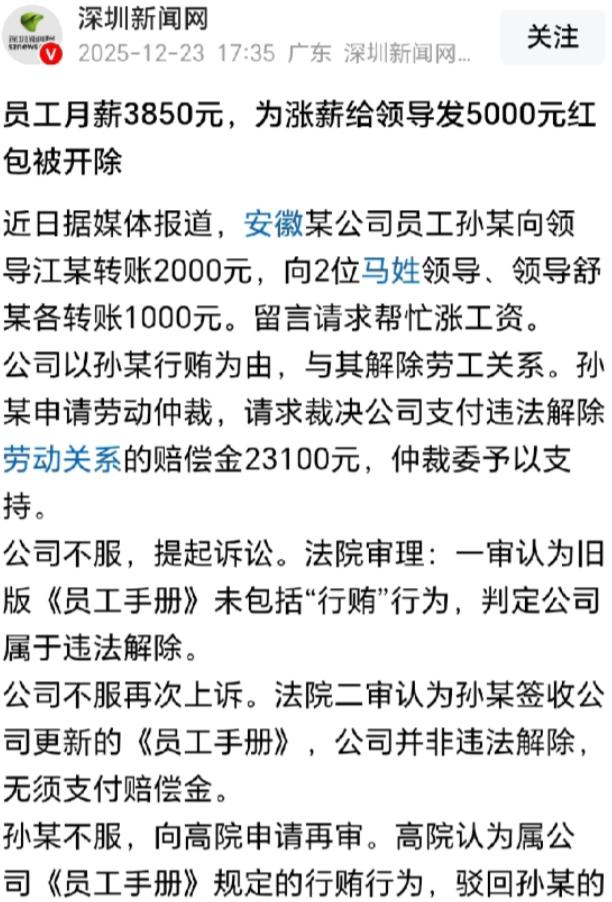 安徽,一小伙月入3850元,生活压力山大,为涨薪,他绞尽脑汁,竟拿出5000元给4个领导发红包,江姓领导2000元,另三个领导各1000元,还在留言里请领导帮忙。本以为能换来涨薪,结果工资没涨,反被公司以行贿为由开除,小伙不服,先后提起仲裁和诉讼,历经三次审理,最终落得个人财两空,不禁感叹:为什么涨薪就这么难! 安徽一位小伙孙某的经历,说出来满是心酸与无奈,每月到手工资死死卡在 3850 元,除去房租、水电费,再买些油盐酱醋和日用品,剩下的钱寥寥无几,生活压力大得让人喘不过气。 更让他心里不是滋味的是,当初同批进公司的同事,早就升职加薪,日子过得有声有色,而自己却在岗位上原地踏步,工资条上的数字多年纹丝不动。 强烈的落差感和生活的窘迫,让孙某迫切想涨薪,他思来想去觉得光靠埋头干活可能没用,是不是得懂点 “人情世故”?一番纠结后,他做出了一个大胆的决定,把平时省吃俭用攒下的 5000 元积蓄拿出来,分给 4 位领导发红包,希望能换来涨薪的机会。 他还特意分了轻重缓急,分量最重的江姓领导,他转了 2000 元,另外三位平日里说话有分量的领导,每人各转 1000 元,转账时他小心翼翼地写下留言,言辞恳切地请领导们多多关照,隐晦表达了希望涨薪的想法。 钱转出去后,孙某心里满是期待,甚至有些亢奋。他天真地以为,这笔 “心意” 能打通关节,接下来只需要等着工资上涨就行,那段时间他干活比平时更卖力,每天都充满干劲,仿佛已经看到了工资条上数字变化的曙光。 可现实却给了他狠狠一击。涨薪的消息没等到,一纸冷冰冰的《解除劳动关系通知书》先送了过来,公司给出的理由很明确,他的行为构成了行贿,严重违反公司规定决定直接开除。 孙某拿着通知书彻底懵了。在他看来,自己只是想通过 “走人情” 求进步,没想到会被定性为 “商业贿赂”,不仅工作没了那 5000 元血汗钱也打了水漂,委屈、不甘和愤怒一股脑涌上心头,他觉得公司的处罚太严厉,简直 “不讲武德”,断了自己的生路也太不近人情。 咽不下这口气的孙某,决定通过法律途径维权,可接下来的经历,像坐过山车一样跌宕起伏,劳动仲裁阶段,仲裁委听了孙某的遭遇,考虑到他是在生存压力下的无奈之举,手段虽不合规,但公司直接开除的做法也过于严苛,最终裁决公司赔偿孙某 23100 元,看到这个结果,孙某原本灰暗的心重新燃起希望,觉得总算有人理解自己的难处。 但公司并不认可这个裁决,反手提起了上诉,一审法院审理时,翻阅了公司依据的旧版《员工手册》,发现里面并没有明确写着 “行贿属于违规行为”,按照 “法无禁止即可为” 的原则,认定公司解除劳动合同违法,这一下孙某觉得胜利的天平彻底向自己倾斜,连老天都在帮自己。 可命运总在不经意间开玩笑,案件进入二审阶段,剧情发生了根本性反转。公司有备而来,拿出了新版《员工手册》,上面清清楚楚写着 “行贿属于严重违规,公司有权解除合同”,更致命的是,公司还出示了孙某曾经签收这份新手册的记录,那个签名成了压垮他的最后一根稻草。 二审法院面对铁证,只能依据新规章制度判决,认定公司的处理合法,不需要支付任何赔偿,眼看即将到手的两万多赔偿金瞬间蒸发,孙某从云端狠狠摔回谷底,他不死心又向高院申请再审,试图做最后一搏,可司法程序的严谨容不下太多同情,高院最终驳回了他的申请。 这一连串的折腾,耗时耗力,最终却落得个彻底的负数:薪没涨成,丢了原本的工作,搭进去 5000 元积蓄,连最后的赔偿金也没摸着,站在街头手里攥着败诉的裁决书,孙某满心苦涩忍不住感叹,为什么涨薪就这么难! 他原本只是想改善生活,却因为一时糊涂,漠视了职场规则,最终酿成大错,这场代价高昂的职场博弈,不仅让他失去了工作和积蓄,更让他明白想要获得回报,靠投机取巧的 “人情世故” 行不通,唯有脚踏实地、遵守规则,才是职场生存的正道。