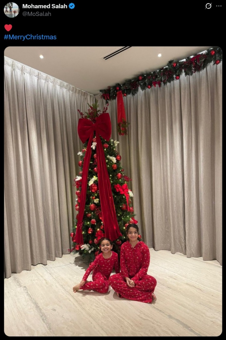 萨拉赫在社媒中配上了两个女儿与圣诞树的照片。