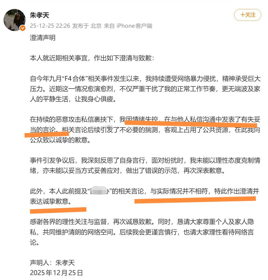 朱孝天 大半夜的发文 公开澄清自己说了错话 就占用公共资源道歉 说自己因“F4合体”之事,长期受网暴侵扰,情绪失控,以至于这几天说的话都是没有事实依据的。 真是想一出是一出,昨天还信誓旦旦的和别人私信聊天,说什么黄牛票,内涵某某假唱,今天就不认账了。 F4不带他玩也是有原因的,朱孝天管不住自己的嘴,祸从口出,是他先表达和另外三人不熟,也是他先拒绝合体的,之后反过来又说人家断联。 难不成要人一直追着他求他答应,又不是没他不行,结果人家改F3加阿信,他又坐不住了,各种酸。 这份澄清避重就轻,互联网是有记忆的,大家眼睛也是雪亮的,说辞或许是迫于某些压力,但只会让人觉得他有多拎不清和拧巴。 自身资源枯竭,阿信好心组局请他们回来,无非就是想帮他们,其他三个都没说什么,只有朱孝天在那阴阳怪气。 简单点说就是几个人玩不到一起,没必要黑这个黑那个,从朱孝天过往的言论可以看出他很没情商,和坦诚直性子没关系,看似波澜不惊,实则逻辑混乱,前后不一漏洞百出。 自己单独出来开演唱会,结果不尽如人意,朱孝天如果再管不住乱说话的坏毛病,这两年靠直播挽回来的路人缘就又要败光了,糊是有原因的。 朱孝天道歉 如何看待朱孝天疑似在粉丝群内涵阿信假唱
