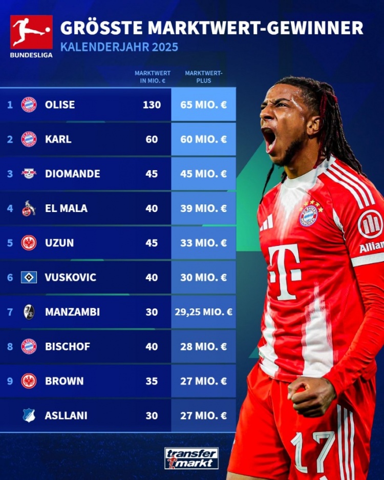 直播吧12月26日讯德国转会市场盘点了2025年德甲身价涨幅榜,拜仁两将奥利塞、伦纳特·卡尔分别上涨6500万欧和6000万欧位居前二。