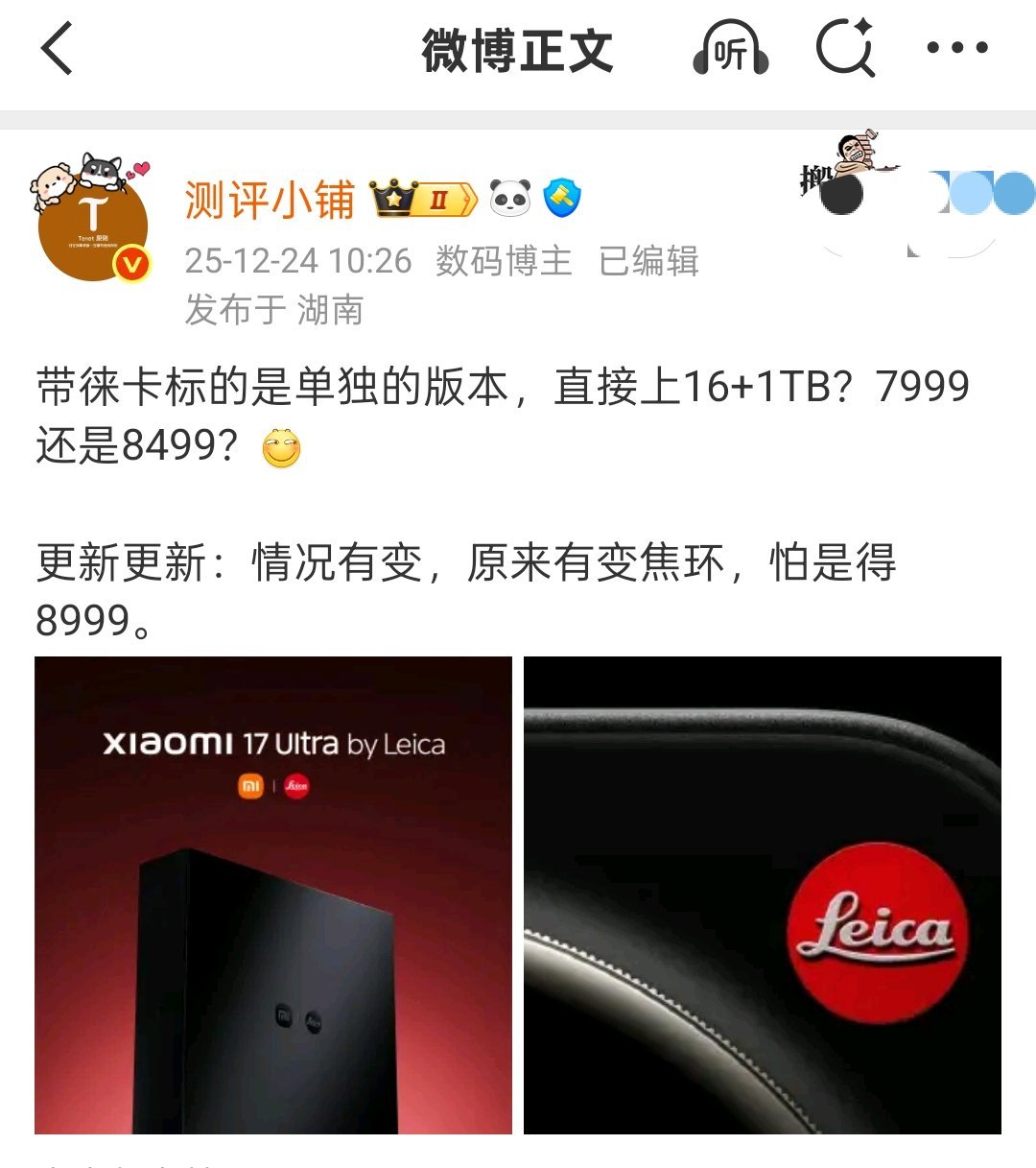 说中啦,徕卡版的小米17 Ultra 16+1TB 8999,怕你们还是嫌贵,雷总还特意留了一个16+512GB版本,7999!只比普通版多500!你就能获得一个可乐标和一个变焦环和一系列独占的相机模式!买什么普通版?