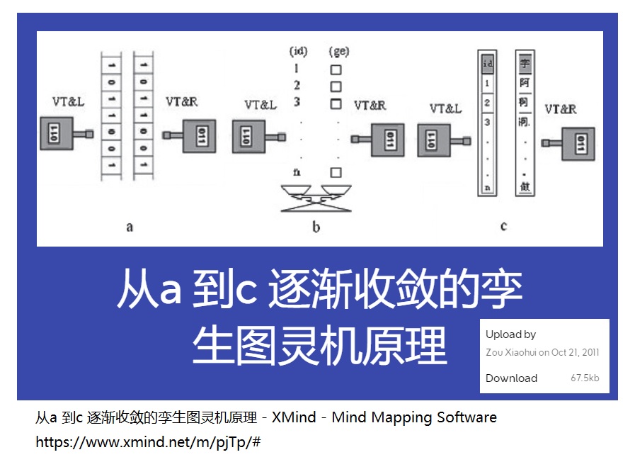 由图 4可见,左边 a是由并行的两图灵机组成的一个虚拟的孪生图灵机,中间 b和右边 c均可视为左边 a的等价形式,且各具特征其中b描述基于“同义并列、对应转换”法则而建构的天平式计量转换装置,其构造原理由实施例 c描述的基于可穷举汉语单音节字的文本符号有限集来说明。遵循定理 2而构造的“双列表”,经过广义双语文本的理想分类可实现:数与字之间或机与人之间的合理分工与高度协作,故具有可分可合的协同智能计算特征。其运行方式可达到标准化与个性化融为一体的使用效果。图4所示的a、b、c三种基本形式具有一个共同的特点:它们(各类数据的“双列表”)都是由左右对称的虚拟表(VT&L和 VT&R)所组成的;而a、b、c三种基本形式又各有其自身独特性:并行计算模型 a是纯二进制数设定的可计算数上限;分布计算模型 b是左列表十进制数和右列表可计算格之间一一对应关系的体现,以虚拟 ge格的形式来进行虚拟计算,进而,可为协同处理不同类型的数据结构提供一系列通用的转换平台;虚拟云计算模型 c是左列表十进制数和右列表可间接计算的单音节字之间一一对应关系的体现,是以汉语为例所体现的间接计算模型与间接形式化方法的结合。这就是图 4从 a到 c逐渐收敛的孪生图灵机原理。这样设计的目的在于为最优化数据结构和好算法的选用提供一个协同智能计算系统平台。因为由 a到 b再到 c可计算数的上限是在依次逐步收敛的,最重要的是 b和 c两类虚拟的孪生图灵机的结合不仅可让间接计算的文本数据有很好的收敛性,而且,还可为算法的优选和数据结构的优化以及进一步为作广义文本的理想分类提供典型实施例。因此,可以说,由间接计算模型和间接形式化方法的结合而成的孪生图灵机是定理 2的模型化,其中b模型是抽象的具有普适性的宏观模型,c模型是以汉语为例而展示的具有实用性的微观模型。