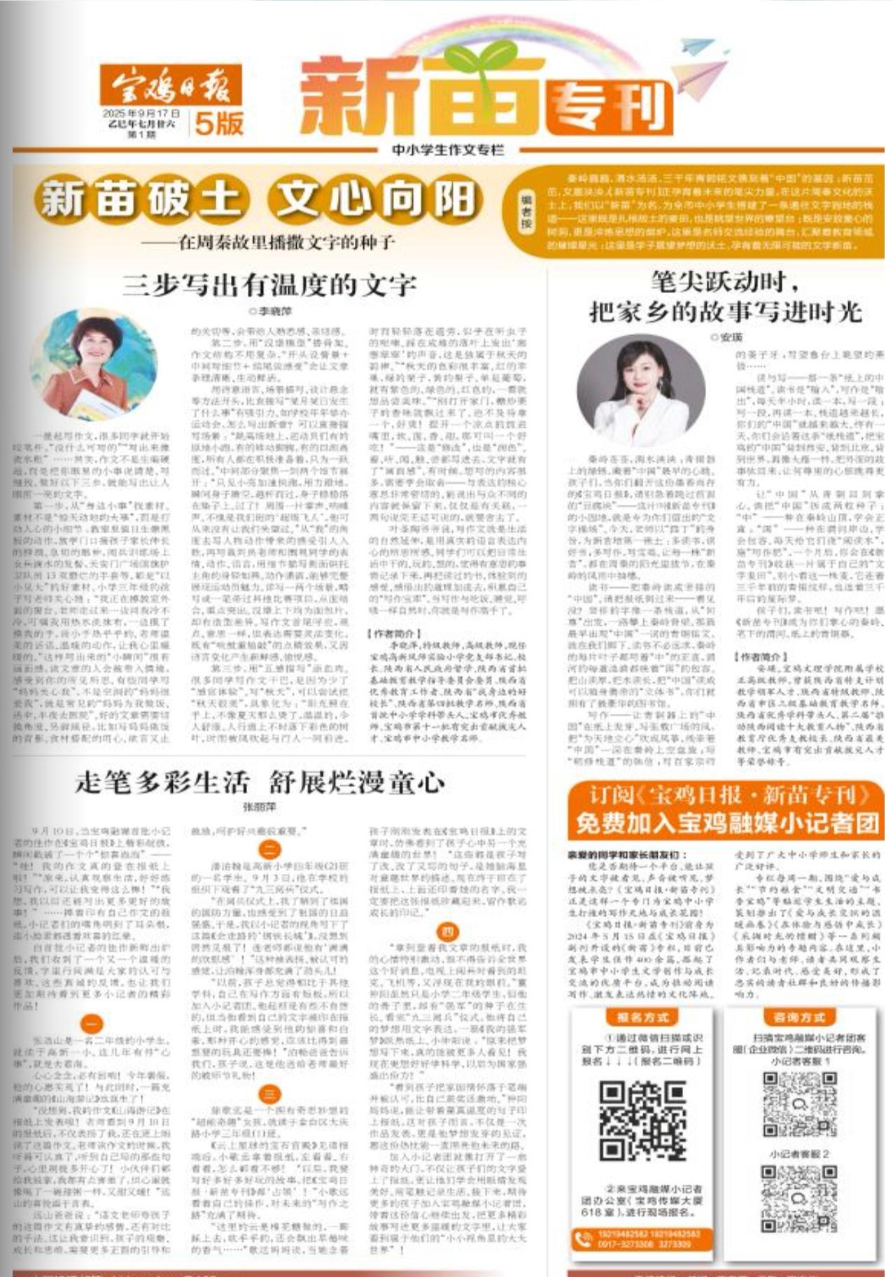 宝鸡融媒体,这要点燃多少青少年的文学梦,这一创新做法当是功在千秋,利在当下。 宝鸡市委机关报《宝鸡日报》,从2024年5月15日开始,在报纸副刊上开设《新苗》专栏, 2025年9月17日升级为《新苗专刊》,每周刊出一期,为全市中小学生搭建一条通往文学园地的桥梁。目前,已刊发中小学生佳作500余篇。 《新苗专刊》在周秦故里的沃土上播撒着文学的种子,在这个写作天地与成长的花园里,孕育着无限可能的文学新苗。这一专刊,成为宝鸡市中小学生文学创作与成长交流的优质平台,成为推动阅读、激发表达热情的文化阵地,成为中小学生观察生活、感受美好、记录时代的成长载体。 相信,也就一、二十年左右的时间,一定会从《宝鸡日报》《新苗专刊》这个园地中,培养和激发出文学新苗,并茁壮成长,走上文学道路,成为参天大树,实现用文字表达情感、反映社会现实、歌颂真善美好、鞭挞假恶丑邪的文学家。 分享今日的感悟 宝鸡身边事
