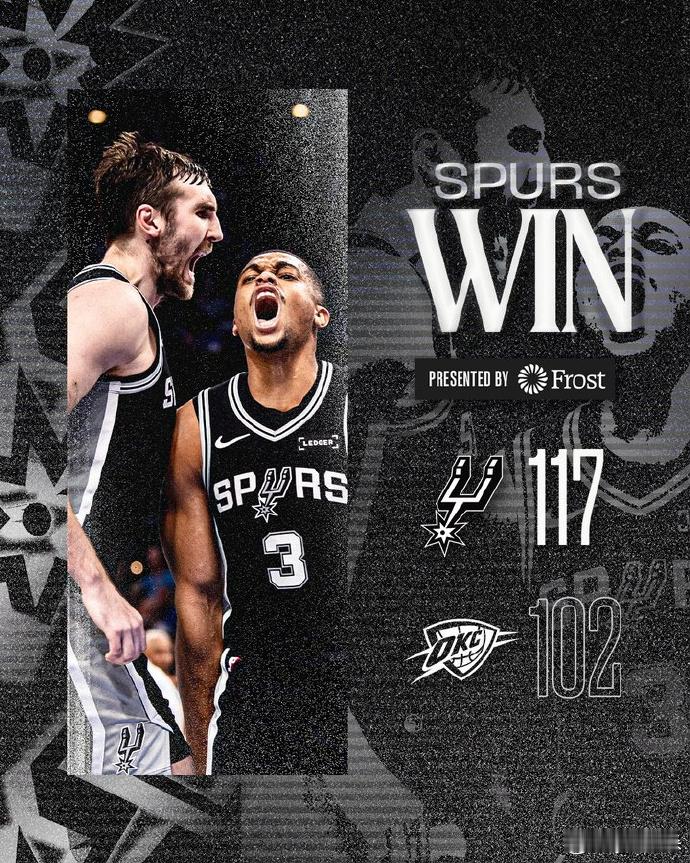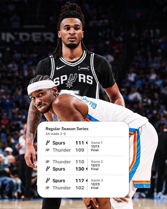 天生相克! NBA圣诞大战,马刺延续了前两次的表现,半个月内第三次战胜了卫冕冠军,不知不觉中马刺已经成为了雷霆的克星!在身高马大的马刺面前,雷霆的短板被无限放大,当突破被无限封堵,中距离手感被身高压制,雷霆也被迫在三分线外发炮,而三分就是木桶中最短的那块板,本场比赛44投仅仅11中,就是最好的证明!而烦恼才刚刚开始,雷霆命中率的下降,也给了马刺更多快攻的机会,这原本是雷霆的强项,而这一场他们在这一项上也输了10分。当然打铁还需自身硬,马刺在这三场的表现也很不错,田忌赛马用的很溜,后卫群轮番爆发扛起进攻,文班亚马无差别错位优势明显,西部第二绝非等闲之辈,有点期待两队的下一次相遇了!马刺也算是给全联盟打了个样,原来雷霆也不是不可战胜的,只是能有几个队有这样的配置,?雷霆破常规赛战绩纪录(73-9)的概率,这下真的希望不大了!