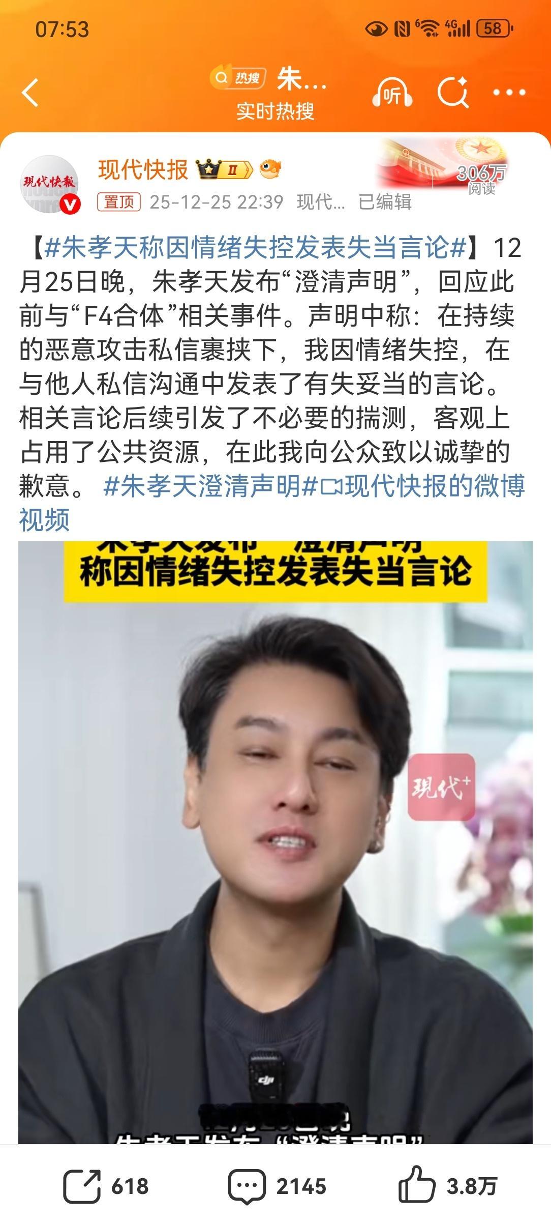朱孝天 五月天【朱孝天称因情绪失控发表失当言论】朱孝天称因情绪失控发表失当言论年纪大了,接受新生事物的能力弱了。这几天在热搜总是看到朱孝天这个名字,但我确实不知道他是干什么的,今早看到热搜前三,他独占两席,网上搜了一下,这是一位中国台湾的男歌手、演员。