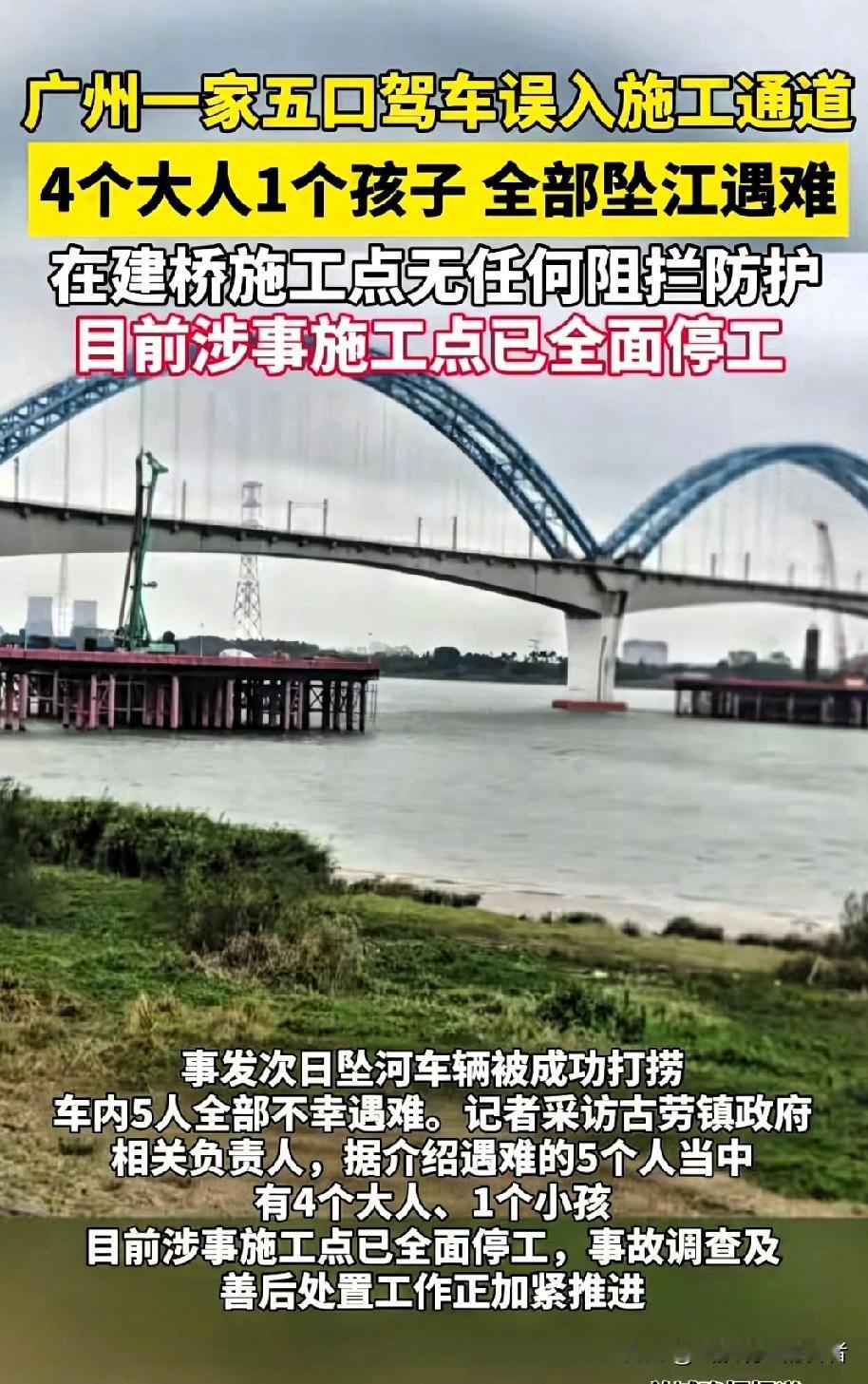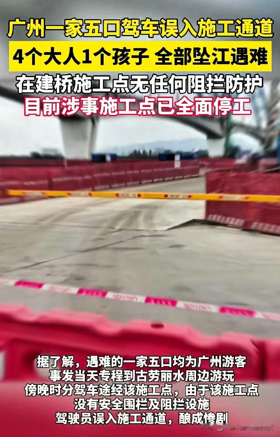 痛心!广州一家五口自驾游,竟坠江无一生还!谁的责任? 开开心心出门旅游,结果一家五口全没了! 广州这家人自驾返程,误入正在施工的大桥,连车带人冲下桥面扎进河里,4个大人1个孩子,全部遇难! 离谱的是,这座施工桥不仅没装护栏,连个警示标识都没有,更没人拦截!知情人说平时无关人员随便上,施工队不管、负责人不问! 事发后现场才被封,有关部门才介入。这哪是意外?分明是安全漏洞酿的大祸! 五条人命啊!到底谁该为这场悲剧负责?