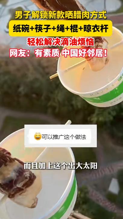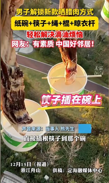 “人怎么能这么聪明!”12月15日,浙江舟山,一男子在阳台上晒腊肉,为了不让油滴到邻居晾晒的衣服上,他就在每块腊肉下面放了一个碗,然后用筷子和热熔胶固定好,这样一来就算刮风也不害怕了!网友:中国好邻居!   张先生(化名)在老家的时候一到冬天都会晒很多腊肠空气中弥漫着咸香的味道,那是他记忆里最踏实的年味,后来张先生到城里工作、定居,住进了楼房,这样的场景便渐渐远去,只剩下回忆。   前一段时间天气转凉,张先生忽然特别想吃腊肠腊肉,超市里虽然也能买到成品,但他总觉得少了点老家的味道,思来想去,他决定自己动手,没有院子、没有屋檐,他把目光放在了自家阳台上,阳台朝南,通风、采光都不错,看起来是个不错的选择。   然而,此方法存在一个弊端,肉类时渗出的油脂会滴落到楼下邻居家的阳台上,不仅可能弄脏阳台,还易引发邻里间的小摩擦。   张先生不想给别人添麻烦,于是开始琢磨解决办法,反复试验后,他想出了一个看似简单却很实用的办法,在每一块腊肉下面放一个碗,用来接油。   将碗稳稳当当固定在腊肉正下方,他又动了一番脑筋,普通悬挂容易晃动,遇到刮风更是不安全,于是他找来几双一次性筷子,用热熔胶把筷子和碗固定在一起,再将整个装置与晾衣架连接,这样一来,腊肉在上,碗在下,结构稳定,既不影响通风,又能有效接住滴落的油脂。   装置完成后,张先生站在阳台前看了半天,越看越觉得满意,几天后,腊肉慢慢变色、变干,油脂顺着肉纹滴进碗里,阳台干干净净,楼下也没有受到任何影响,邻居路过时还特意抬头看了几眼,发现没有油渍滴落,也就放下了心。   张先生把这个“阳台晒腊肉”的过程拍成照片发到了网上,本以为只是记录生活,没想到引来了不少网友围观,有人调侃他“城市版腊肉工程”,有人夸他心细、有公德心,也有人表示学到了新方法,准备回家试试,还有网友感慨,在钢筋水泥的城市里,这样的烟火气反而显得格外温暖。   对张先生来说,这不仅仅是晒几块腊肉,更像是在有限的空间里,保留一份来自老家的生活方式,他用自己的办法,在不影响他人的前提下,完成了一次对记忆和味道的延续,或许正是这种认真对待生活细节的态度,才让网友们纷纷点赞、留言。 信息来源 :美丽浙江