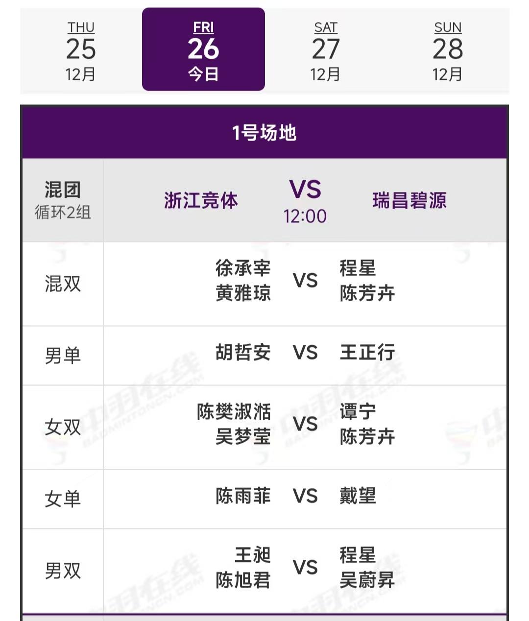 今天羽毛球迷有福了,中午看徐承宰/黄雅琼,晚上有石宇奇对阵桃田贤斗[鼓掌][鼓掌][鼓掌] 羽超联赛12月26日12点对阵名单 【1号场地:浙江竞体 - 瑞昌碧源】 1、徐承宰/黄雅琼 - 程星/陈芳卉 2、胡哲安 - 王正行 3、陈樊淑湉/吴梦莹 - 谭宁/陈芳卉 4、陈雨菲 - 戴望 5、王昶/陈旭君 - 程星/吴蔚昇 【2号场地:江苏羽超 - 厦门银行】 1、朱彦澎/鲍骊婧 - 朱一珺/黄可欣 2、陆光祖 - 雷兰曦 3、何冰娇/张殊贤 - 陈颖颖/王子萌 4、徐文婧 - 韩悦 5、黄荻/孙文骏 - 郭若涵/林祥毅 今晚18:30天王杯挑战赛,第四场,石宇奇对阵桃田贤斗【期待】