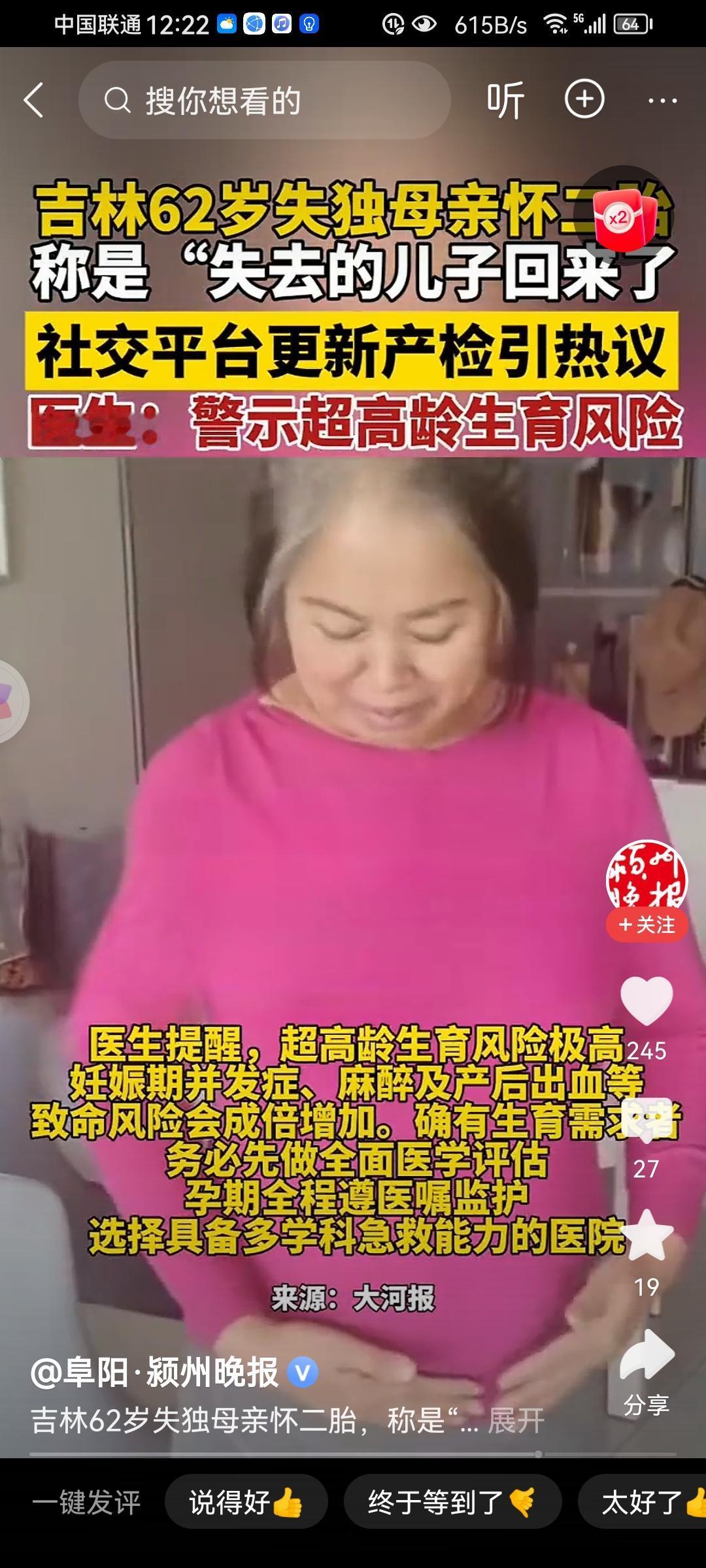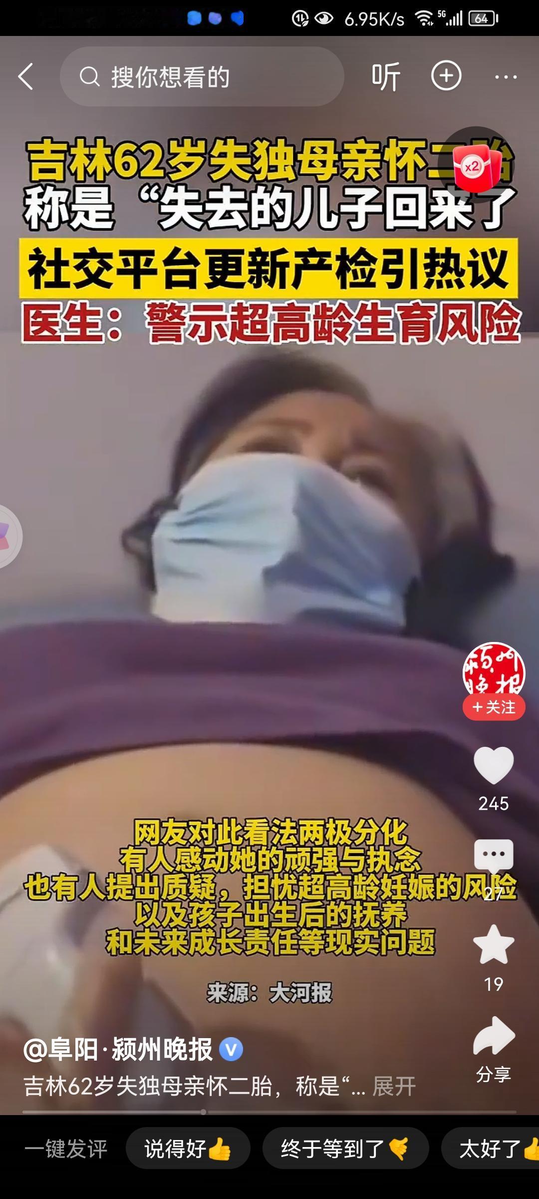 近日,一位62岁的吉林女子在社交媒体上公开怀孕6个月的消息,引发广泛讨论。据其账号主页介绍,她2025年正月失去独子。 然而,这位女子的故事似乎远比表面上的新闻更为复杂。她的眼神中带着一丝温柔与坚韧,那份对生命的渴望仿佛穿越了岁月的尘埃,让人不禁为之动容。在这个年龄段选择怀孕,无疑是一场与时间的赛跑,更是一份对生命的执着追求。或许,她曾在失去儿子的那一刻,感受到生命的脆弱与无常,也许她经历了无数次的内心挣扎与反复思索,才最终鼓起勇气迎接这个新生命的到来。 社会的目光复杂而多元,有人敬佩她的勇气,有人质疑她的决定。面对外界的议论,她似乎早已学会用一种淡然的姿态去应对。她知道,人生没有绝对的答案,每个人的选择都值得尊重。或许,她只是在用自己的方式,去书写一段不同寻常的生命篇章。她的故事,也让人反思关于生命、关于爱、关于责任的更深层次意义。 在医学角度看,超高龄产妇的风险确实不容忽视。医生们的提醒极为中肯,孕期的每一步都需要细心呵护与专业指导。对于这位女子而言,选择一家具有多学科急救能力的医院,进行全面的医学评估,无疑是最为明智的决策。毕竟,母婴的安全永远是第一位的。现代医学虽能在一定程度上降低风险,但也无法完全消除所有潜在的危机。她的坚持与勇气,正是在面对这些风险时的一种无声抗争。 或许,我们更应该以一种包容和理解的心态去看待她的选择。每个人的人生轨迹都不同,岁月在每个人身上都刻下了不同的印记。有人选择早早成家,有人则在晚年迎来生命的奇迹。这些不同的选择,都是生命的多样性与丰富性的体现。她的故事,或许会激励更多人去思考生命的意义与价值,也让我们懂得:爱,从不设限。 在未来的日子里,无论她的决定如何,愿她都能在爱与希望中找到属于自己的平衡。生命的旅途上,每一次选择都值得尊重,每一份坚持都值得敬佩。愿这位吉林女子的勇气,成为一种温暖的力量,照亮那些在生命十字路口徘徊的人们。毕竟,人生本就是一场不断探索与超越的旅程,而爱与希望,永远是我们最坚实的依靠。高龄产妇怀孕