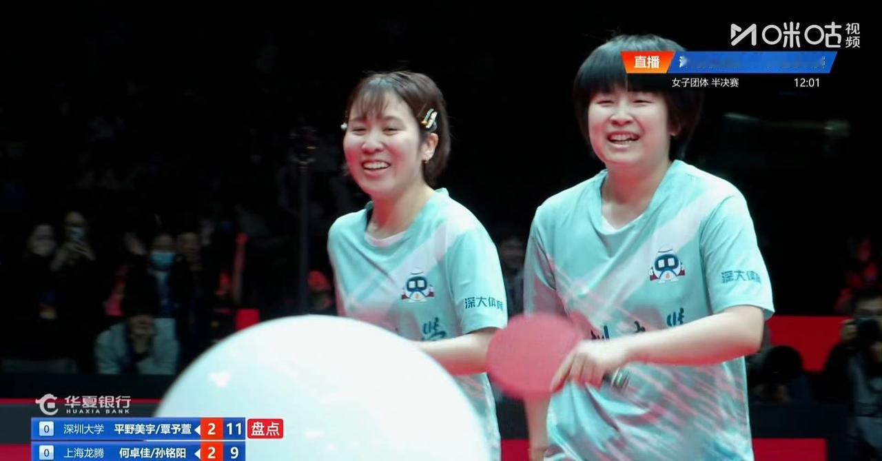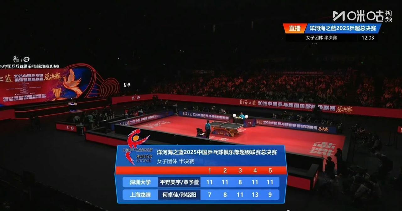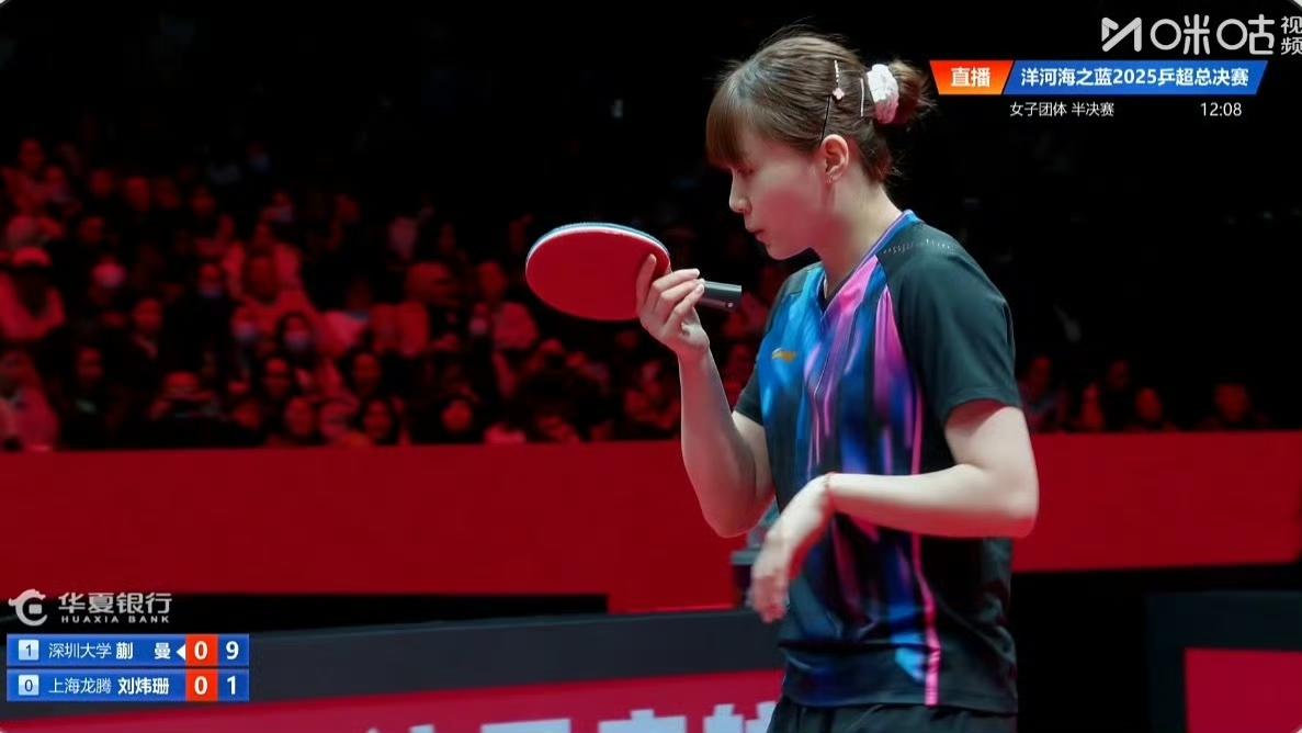 蒯曼先胜刘炜珊一局! 第一局深圳大学队的蒯曼11-2先胜刘炜珊,蒯曼近期球技大涨,上来就是一波9-0 ,最终第一局很有实力的刘炜珊仅得了2分。 但接下来的第二局蒯曼失误比较多,9-11不敌刘炜珊,两人打成了1-1平! 第一盘深圳大学队的平野美宇/覃予萱3-2差点被上海龙腾队的何卓佳/孙铭阳让二追三[捂脸] 这是2025年乒超联赛总决赛阶段的女团半决赛,评论区继续播报战况哦[笑哭]。