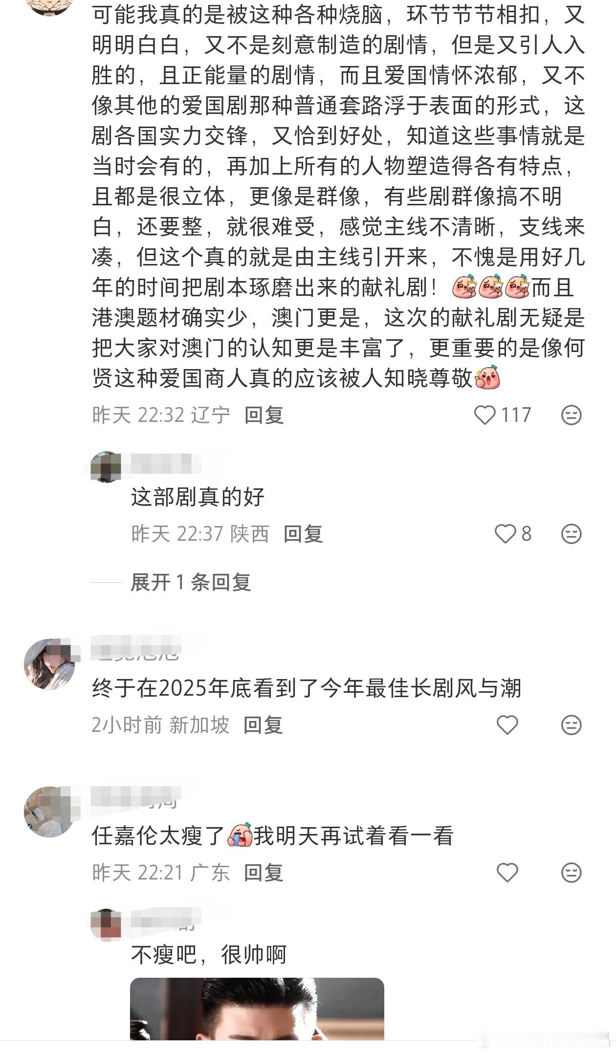 这个帖子下面评论区好多路人剧粉对电视剧风与潮 各种真心实意的夸夸夸,说好久没看到这么好看的献礼正剧了!任嘉伦风与潮