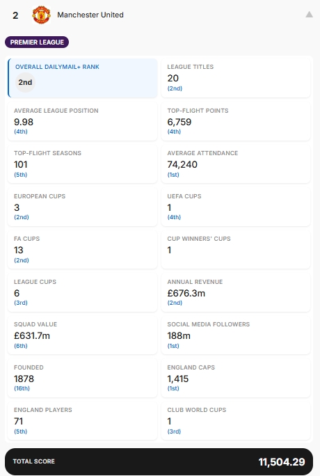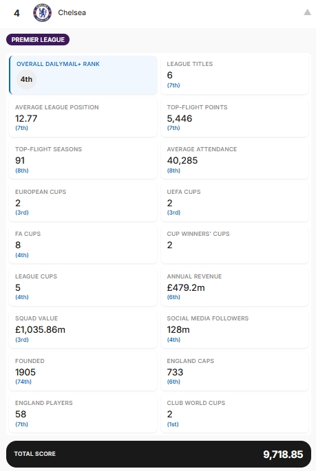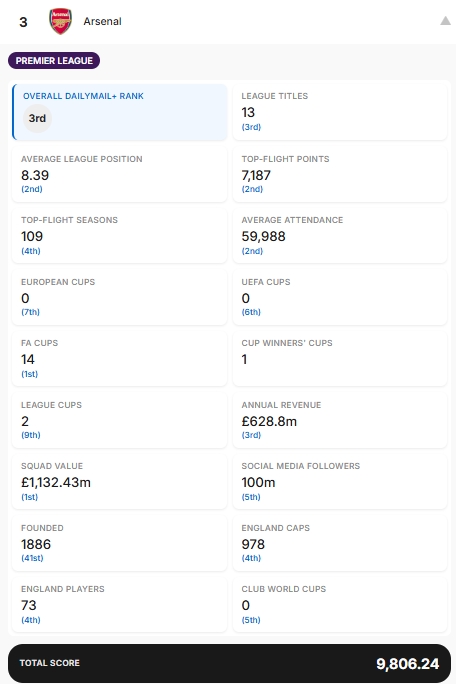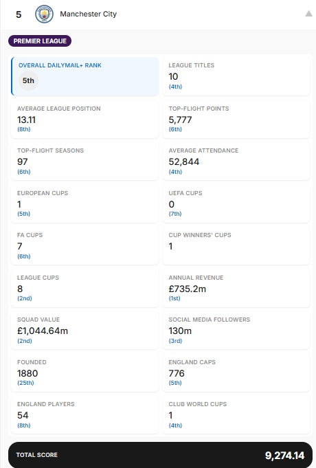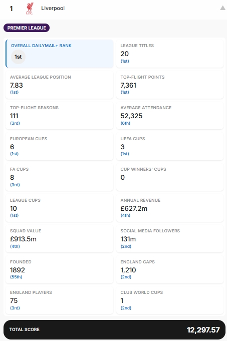 17项数据分别为:赢得的联赛冠军、历史平均联赛排名(英冠第一名算作第21名,英甲第一名算作第45名,以此类推)、顶级联赛总积分、顶级联赛赛季总数、过去10个赛季的平均上座率、赢得的欧洲冠军杯(包括欧冠联赛)、赢得的欧洲联盟杯(包括欧联杯)、赢得的足总杯、赢得的欧洲优胜者杯、赢得的联赛杯、年度收入、球队价值、社交媒体粉丝数(Facebook、X和Instagram)、成立日期、球员为该俱乐部效力时获得的英格兰队出场次数、在该俱乐部效力的英格兰国脚人数以及赢得的世俱杯。