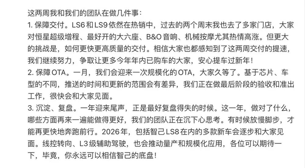 智己CMO李微萌“消失”十几天,一回来就给大家整了个活![吃瓜群众] 2026年:智己LS8等新车排队来,线控转向+L3也要量产了! 重点看看LS8有啥料: 1、体型不小:5085/2000/1807(1817)mm,轴距3060mm,中大型SUV,5/6座可选,空间这块儿应该稳了。 2、激光雷达玩出新花样:车顶露营灯+激光雷达二合一,这脑洞可以啊,实用又有辨识度。 3、纯电续航最高335km(预计WLTC工况),电池有52.1kWh和65.9kWh两种。 你觉得智己LS8这波亮点能圈粉吗?最戳你的是哪个?[吐舌]