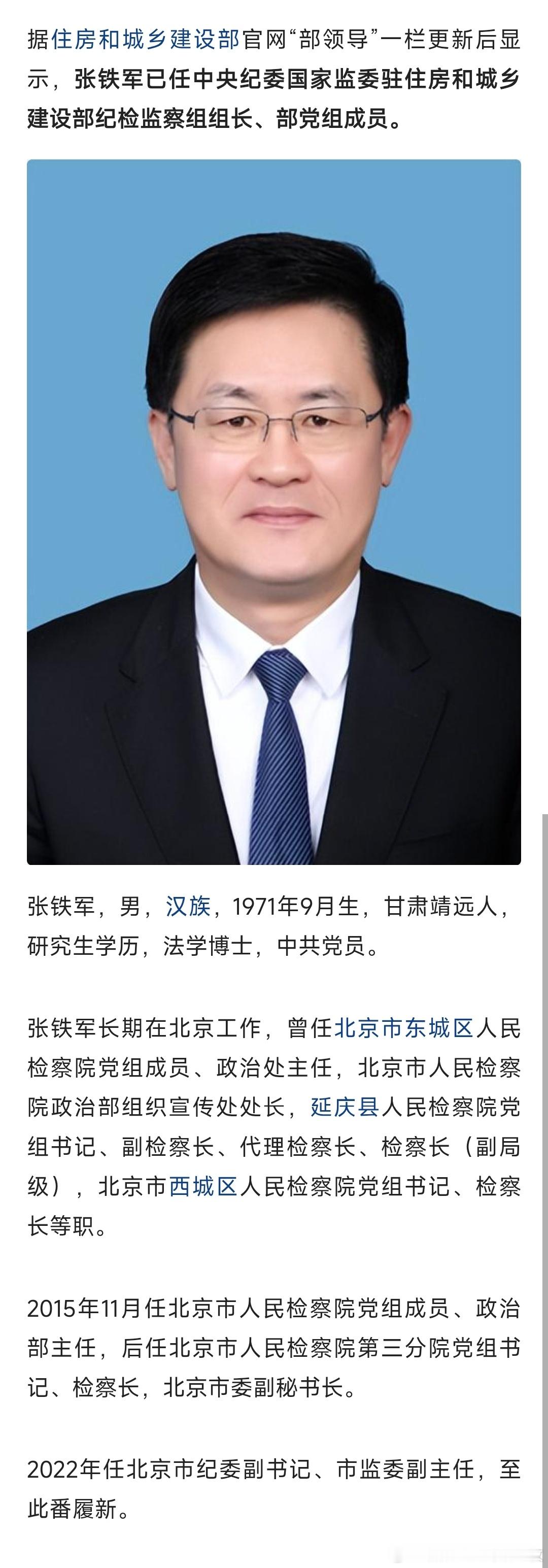 据住房和城乡建设部官网“部领导”一栏更新后显示,张铁军已任中央纪委国家监委驻住房