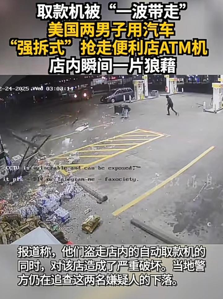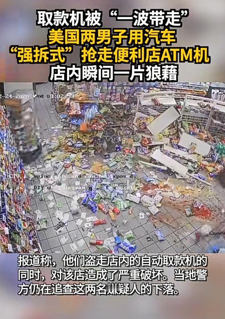 彪悍:美国德克萨斯州北部怀特塞特门市,一名黑衣男子手拿金属缆绳直奔店内取款机,动作凌厉步伐紧凑旁若无人,一副六亲不认如入无人之地,缆绳的另一头连接一辆中型SUV,整个过程持续50秒,店内整齐的食品饮料瞬间洒落一地,以薯片可乐为主,男子看到ATM机被带走心情极度兴奋,步伐轻盈心态愉悦,不得不说论意外之财还得是西部牛仔啊! 通常情况下香港澳门偶尔会出现类似的情节,可那也是电影设计的片段,在美国可是实打实的现场体验,能想到用金属缆绳加汽车动力,这些年轻人其实已经不需要用这样的方式盈利,会开车也算是一种技能,找个快递公司送货不比这来的安全,如果一味寻找刺激的生活这本身方向就是错误的,
