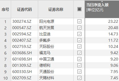 上证报中国证券网讯(记者费天元)Choice数据显示,12月26日,资金净流入额排名前十的个股依次是:阳光电源、航天发展、比亚迪、多氟多、天际股份、福龙马、中国卫通、德明利、天通股份、天赐材料。其中,多氟多、天际股份、天赐材料等均属于锂电池板块。